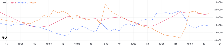 Il Directional Movement Index (DMI) di Bitcoin mostra il suo Average Directional Index (ADX) attualmente a 21,2, dopo aver toccato brevemente 22,9, in aumento da 15,5 due giorni fa.