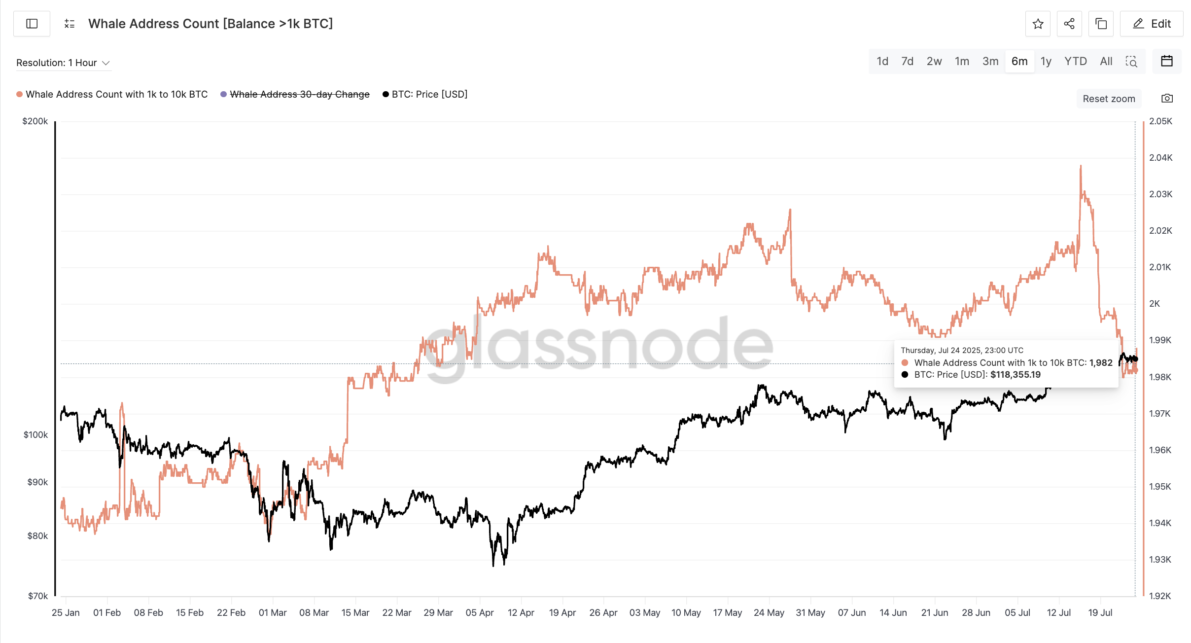 Negli ultimi 10 giorni, il numero di indirizzi di balene che detengono da 1.000 a 10.000 BTC è sceso da 2.037 a 1.982 — una diminuzione del 2,7%. Questo è il calo più ripido nella partecipazione delle balene in oltre sei mesi.