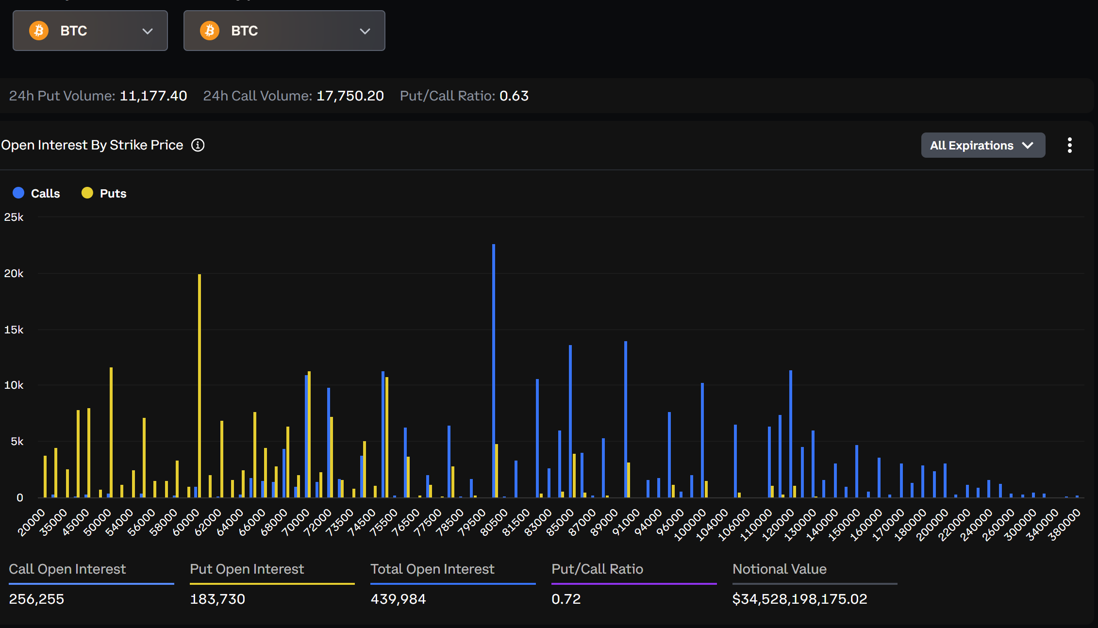 I dati on-chain mostrano che il Traders’ On-Chain Realized Price a 76.800 dollari ha limitato le recenti fasi di sollievo. Su Deribit, l’opzione call su 80.000 dollari è diventata la più scambiata, raggiungendo un valore nozionale di 1,78 miliardi di dollari.