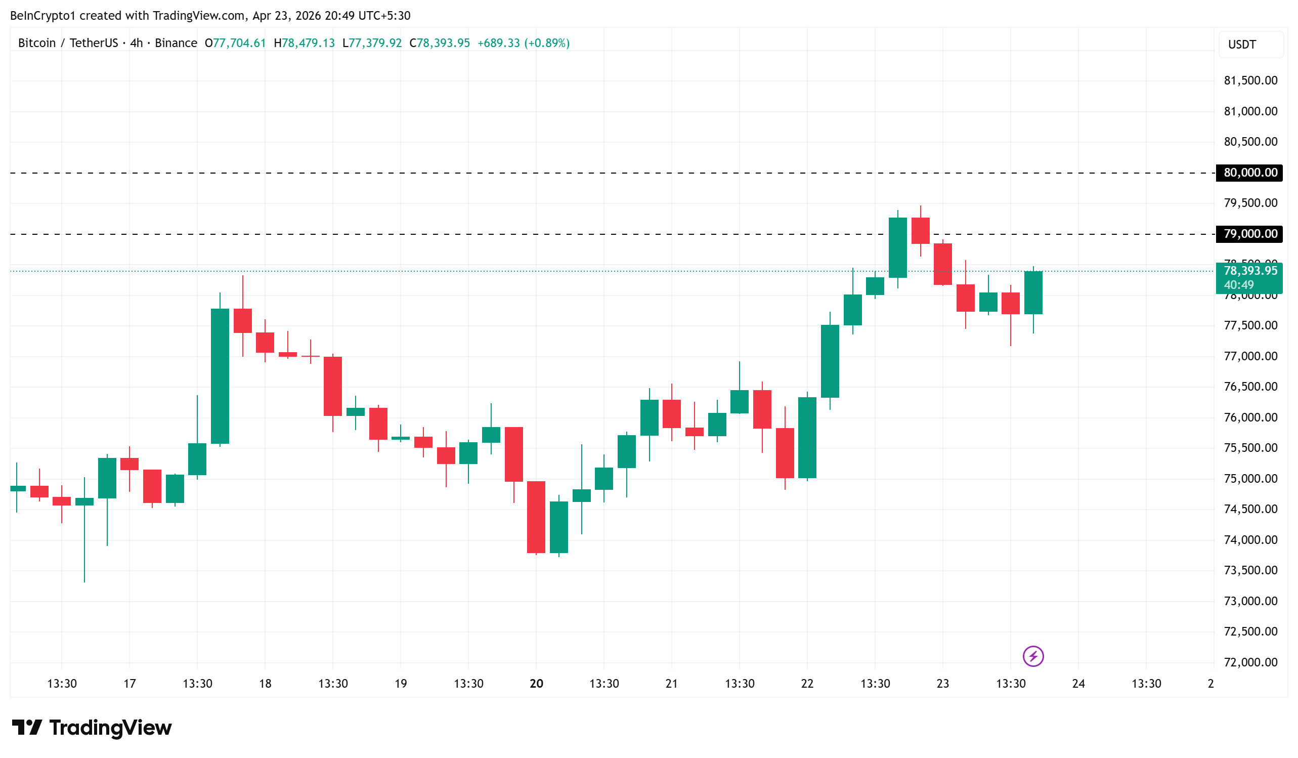BTC ha aperto a 78.193 dollari giovedì, per poi ritracciare verso i 77.465 dollari nel trading della prima mattinata. L’area compresa tra 80.000 e 80.600 dollari ha agito da solido tetto per tutto il mese di aprile.