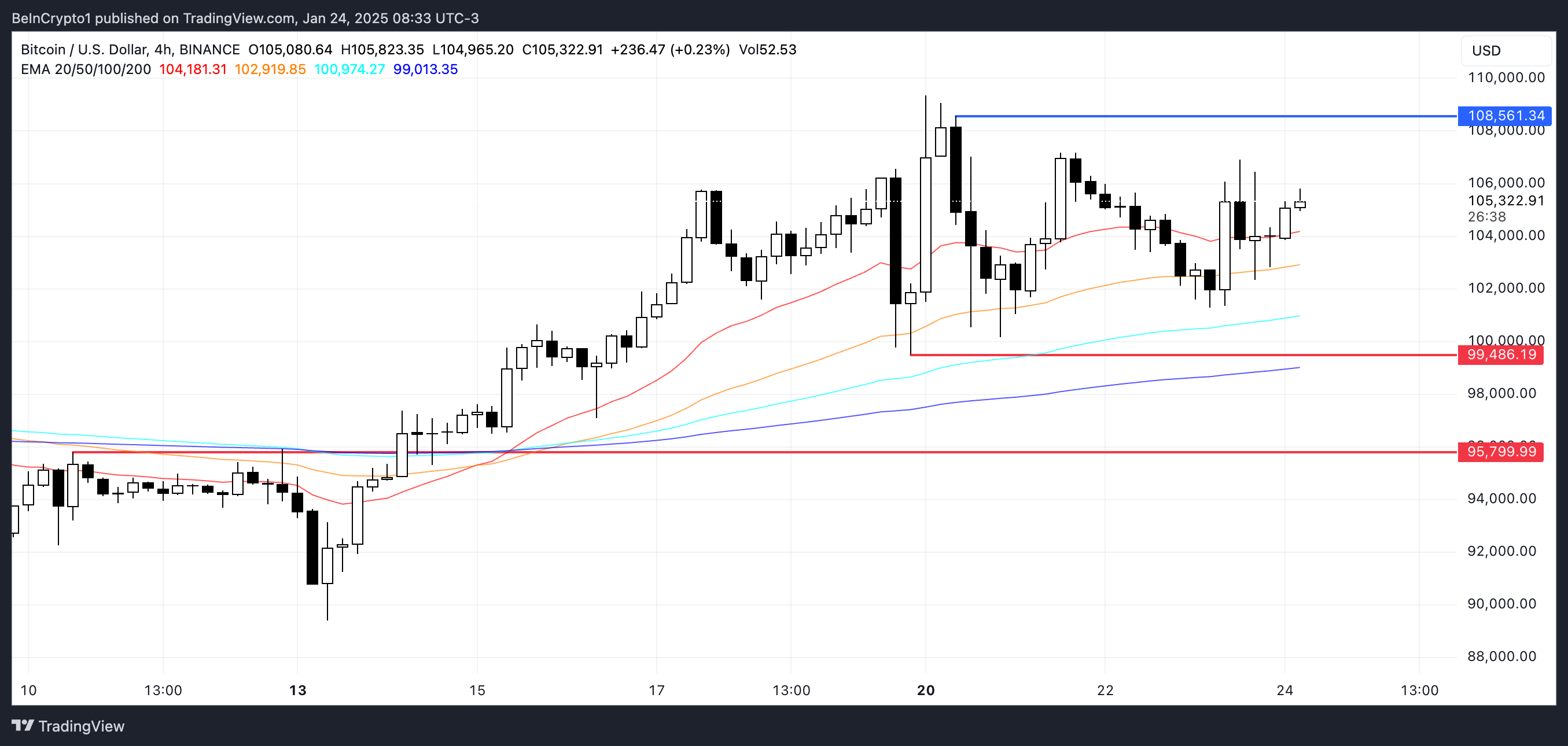 Le linee EMA di Bitcoin sono attualmente rialziste, con le linee a breve termine posizionate sopra le linee a lungo termine, ma la loro mancanza di movimento verso l’alto suggerisce che il mercato potrebbe entrare in una fase di consolidamento.