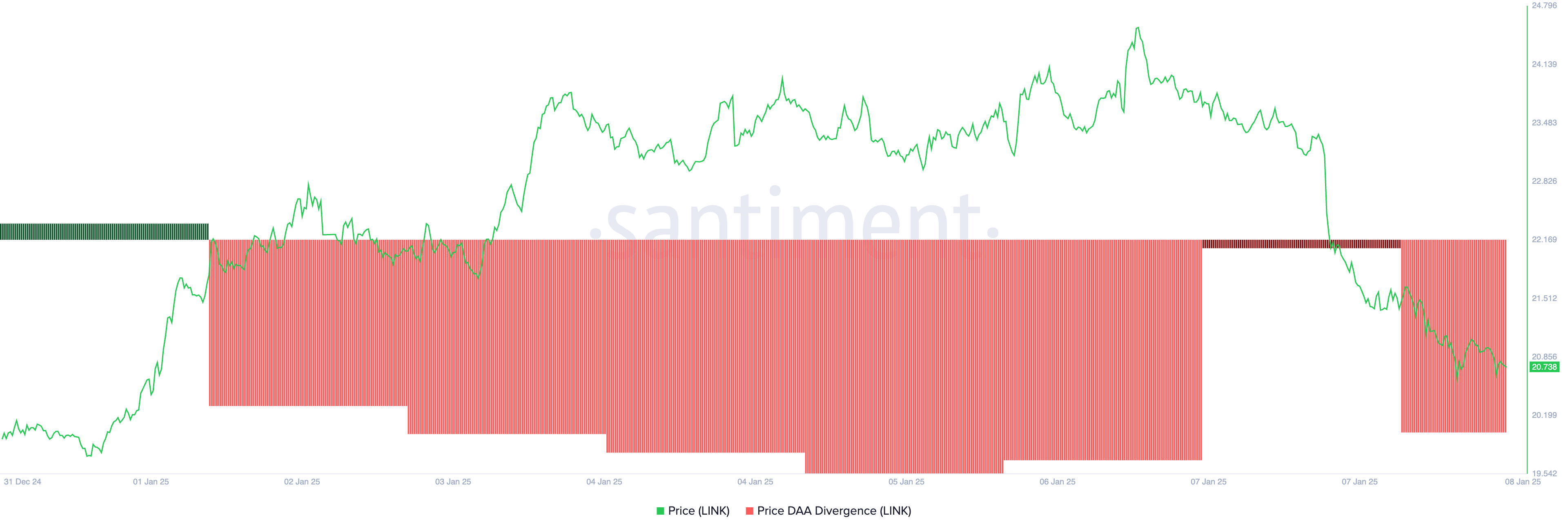 Inoltre, le letture negative dalla divergenza degli indirizzi attivi giornalieri (DAA) del prezzo di LINK evidenziano la bassa domanda per l’altcoin. Al momento della stampa, questo è -56.61%.