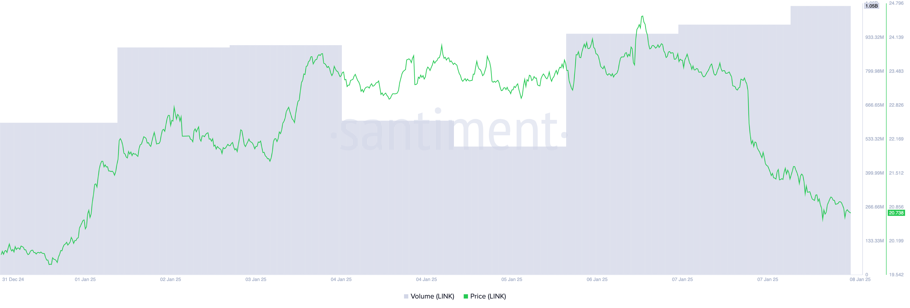 Inoltre, il calo a doppia cifra del prezzo di LINK è stato accompagnato da un aumento del volume di scambio, formando una divergenza negativa. Nelle ultime 24 ore, il volume di scambio del token ha raggiunto 1.06 miliardi USD, aumentando del 28%.