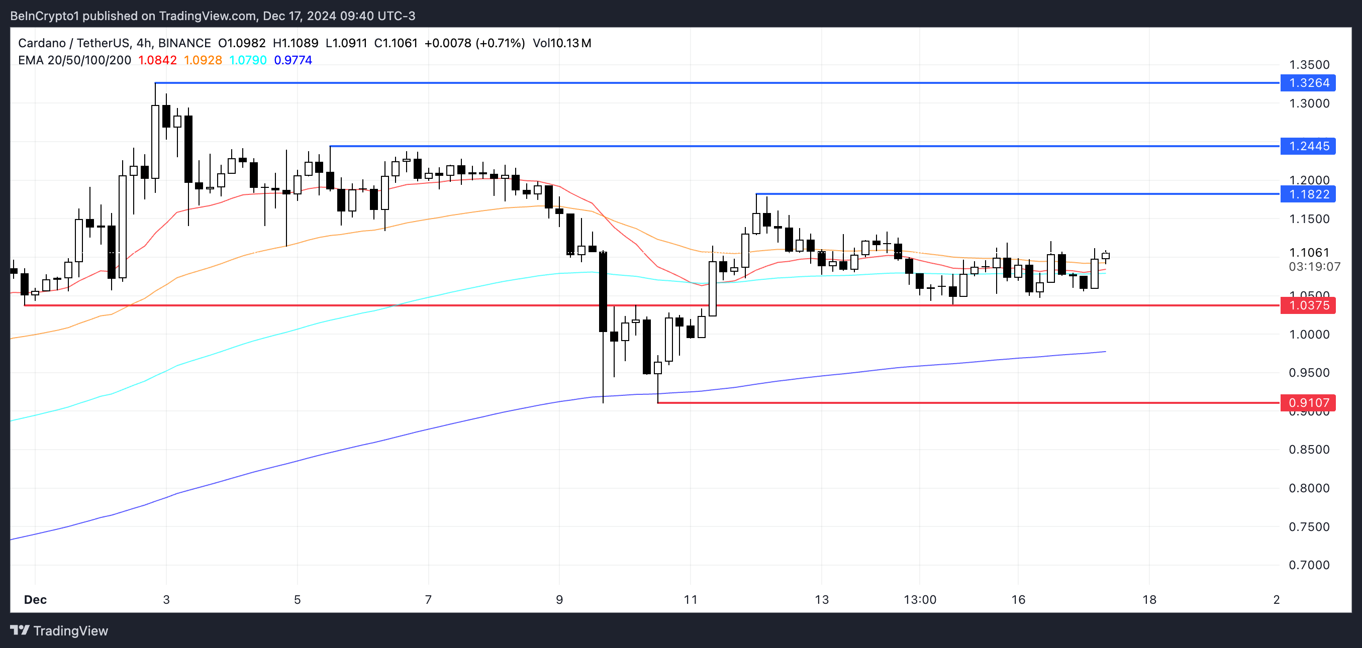 Le linee EMA di Cardano sono attualmente molto vicine tra loro, segnalando una mancanza di forte slancio e rafforzando che l’asset è in una fase di consolidamento.