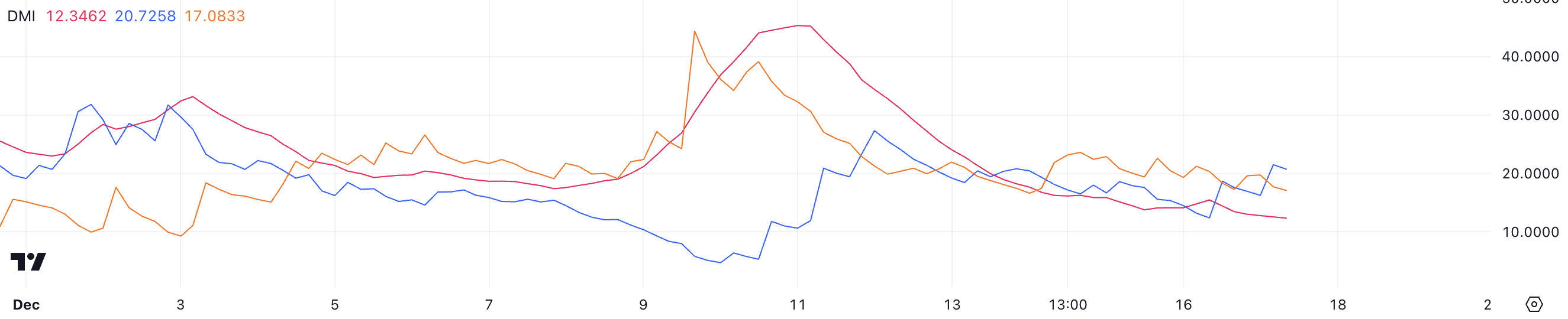 Il grafico DMI di ADA mostra che il suo ADX è sceso a 12.3, un calo netto da oltre 40 solo una settimana fa. L’ADX misura la forza del trend, con valori sopra 25 che indicano un trend forte e quelli sotto 20 che suggeriscono un trend debole o assente.