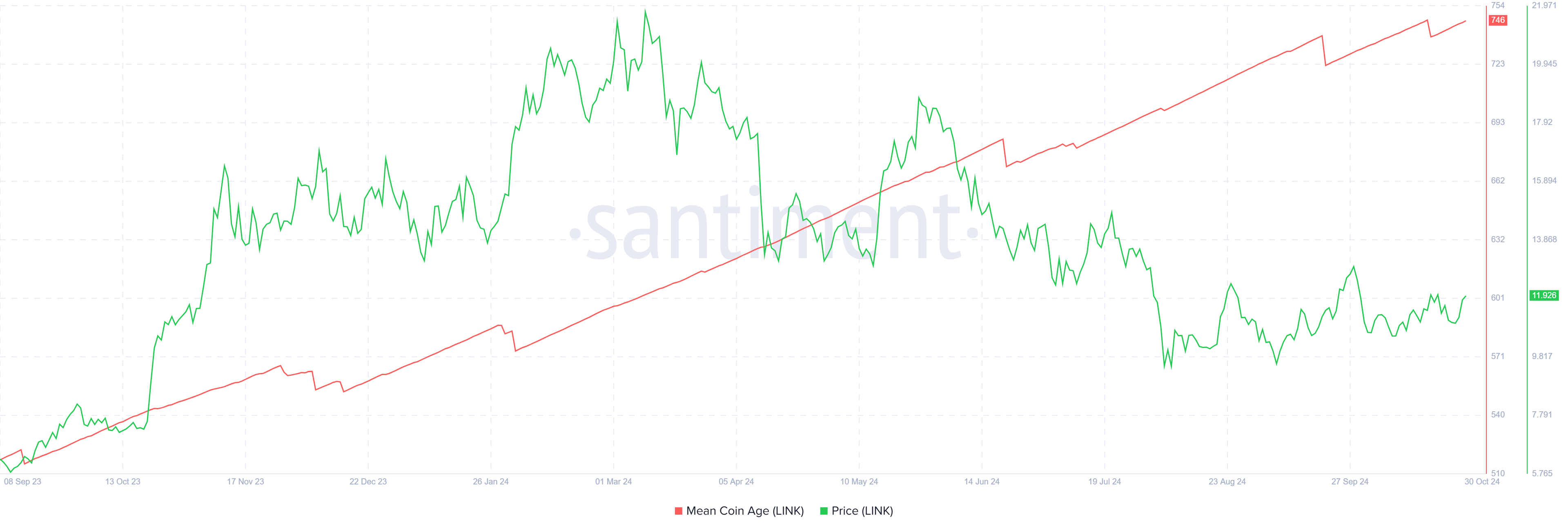 Il sentiment di mercato per Chainlink è rimasto resiliente, con l’Età Media delle Monete (MCA) che mostra costantemente un aumento nonostante l’instabilità dei prezzi. Questa tendenza ascendente nell’MCA indica che i detentori a lungo termine (LTHs) scelgono di mantenere i loro possedimenti anziché spostarli o venderli.