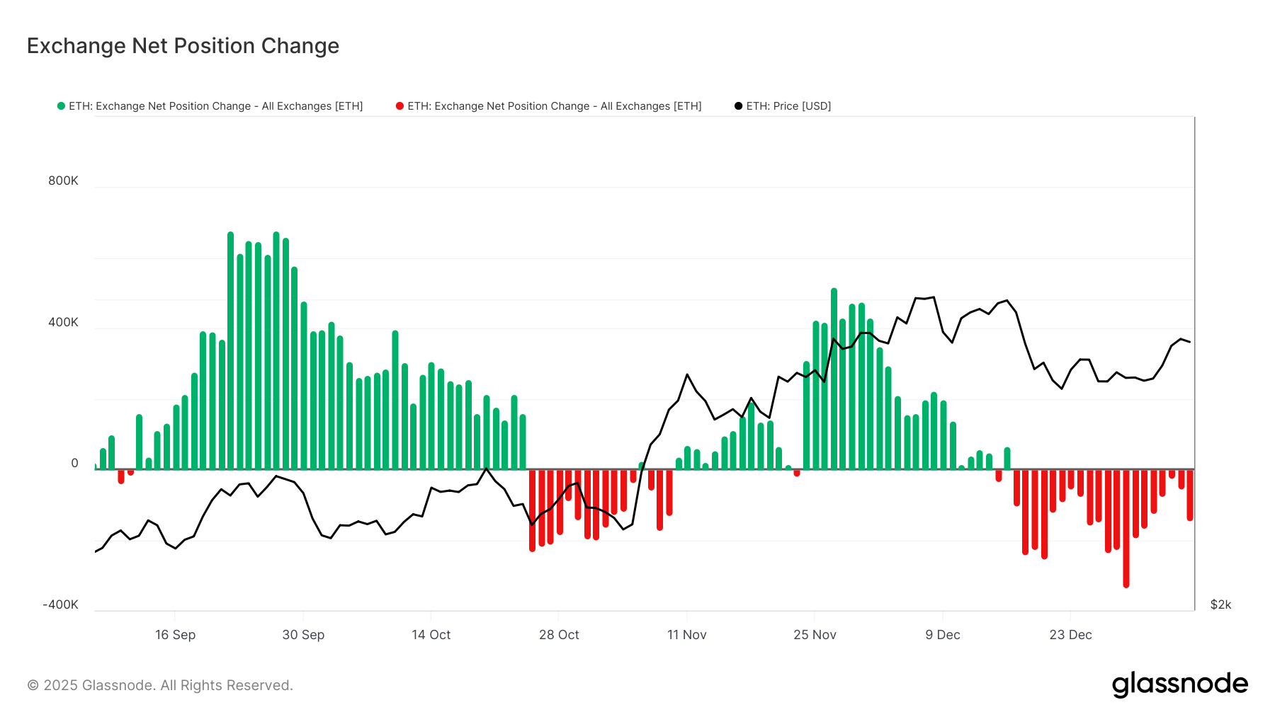 Il cambiamento netto della posizione sugli exchange evidenzia un deflusso sostanziale di 89.000 ETH, equivalente a circa 323 milioni USD. Questi deflussi indicano un’accumulazione crescente mentre gli investitori trasferiscono i loro asset fuori dagli exchange per garantirsi detenzioni a lungo termine.