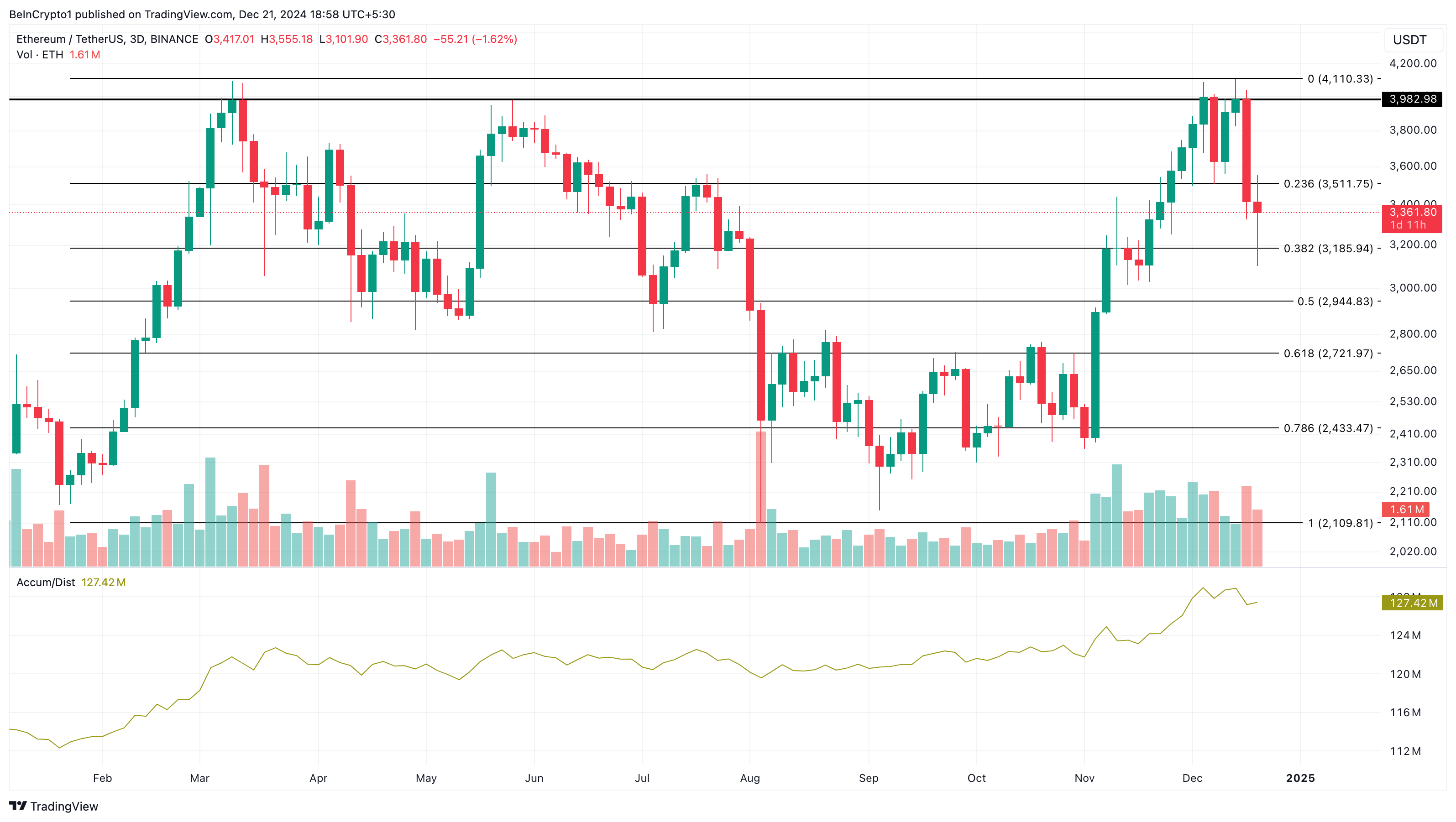Secondo il grafico ETH/USD a 3 giorni, la linea di Accumulazione/Distribuzione (A/D) ha continuato a salire. Una linea A/D in aumento indica che gli investitori stanno acquistando, il che potrebbe spingere il prezzo più in alto. Quando la lettura dell’indicatore scende, indica che gli investitori stanno distribuendo, il che è un segnale ribassista.