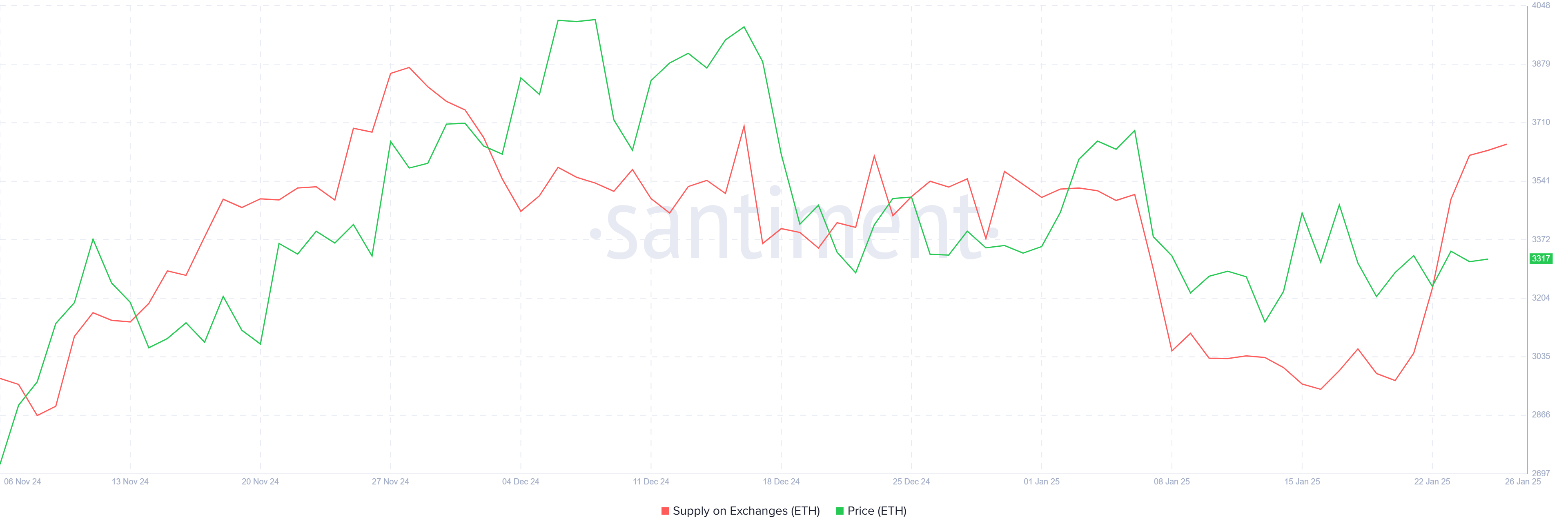 Il sentimento degli investitori riguardo Ethereum è cambiato notevolmente, con i detentori che cercano di vendere i loro asset tra crescente scetticismo. Nell’ultima settimana, sono stati venduti oltre 410.000 ETH, per un valore di oltre 1.3 miliardi USD. Questo picco nelle vendite è evidente nell’aumento dell’offerta di ETH sugli exchange, un chiaro segnale che gli investitori stanno capitalizzando sull’azione recente del prezzo piuttosto che mantenere per guadagni a lungo termine.