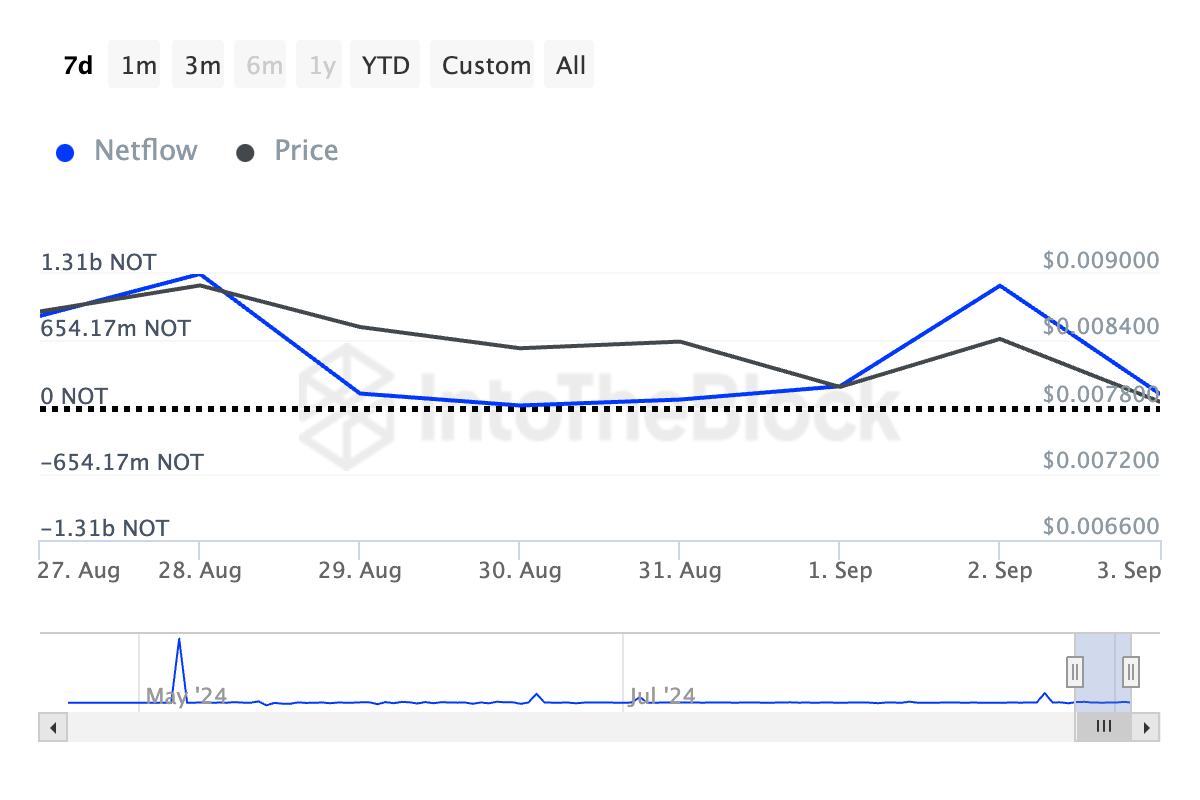 Secondo IntoTheBlock, l’altcoin ha registrato un aumento del 13% degli indirizzi attivi giornalieri negli ultimi sette giorni. Inoltre, la nuova domanda per NOT è aumentata, con un incremento del 46% nel conteggio giornaliero di nuovi indirizzi che scambiano il token in questo periodo.