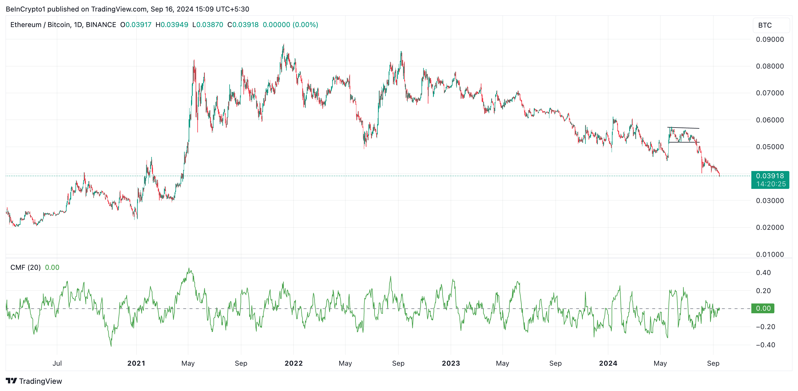 Attualmente, il rapporto ETH/BTC è a 0,039, il suo livello più basso dal aprile 2021. Il calo è iniziato il 24 luglio dopo che la coppia ha rotto al di sotto del canale orizzontale in cui stava scambiando tra il 21 maggio e il 24 luglio.