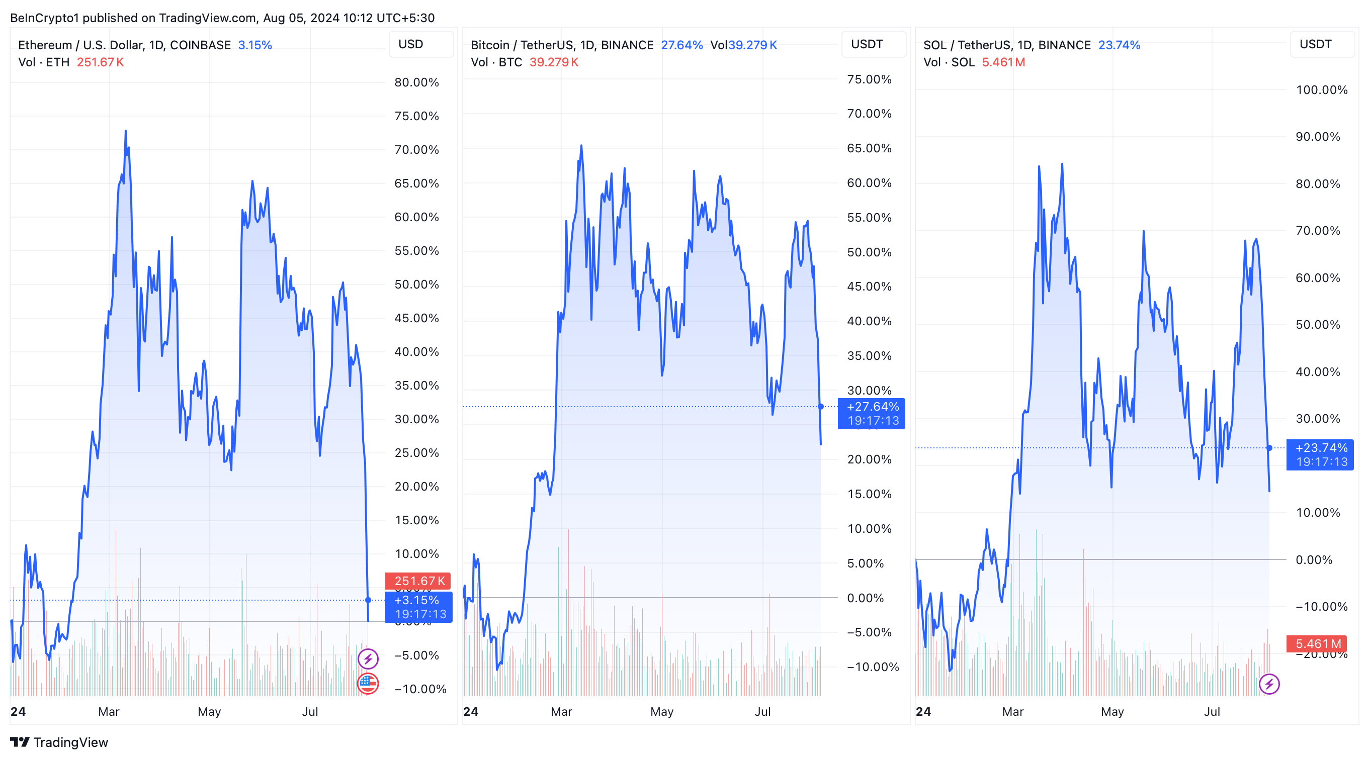Oltre a Ethereum, asset importanti come Bitcoin (BTC) e Solana (SOL) hanno perso il 10% del loro valore nello stesso periodo. Tra le prime dieci criptovalute per capitalizzazione di mercato, Ethereum è stata la più colpita.