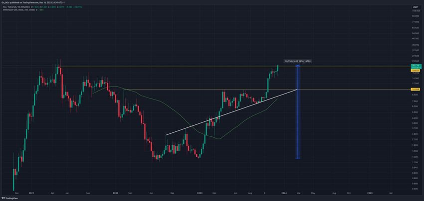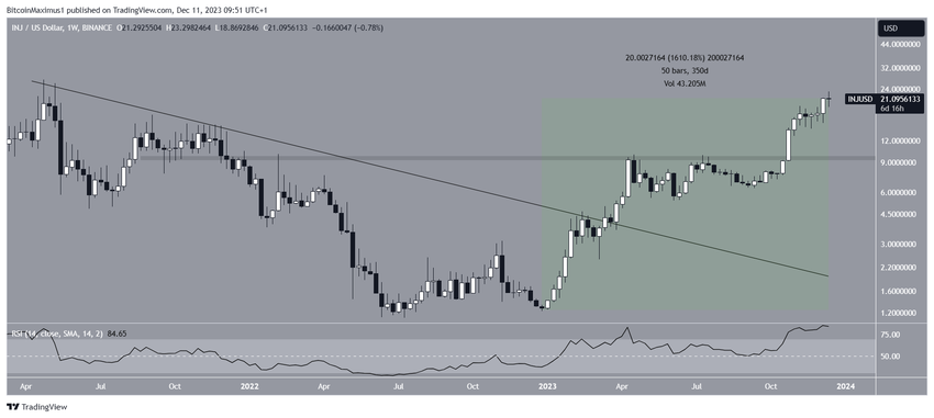 Dopo averla superata in ottobre, il tasso di crescita si è accelerato, culminando con un nuovo massimo annuale di 23,20 dollari quest’anno. Finora, il prezzo di INJ è aumentato di poco più del 1.600% quest’anno.