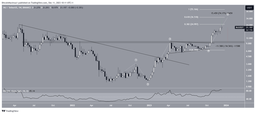 Gli analisti tecnici utilizzano la teoria delle onde di Elliott per identificare i modelli di prezzo ricorrenti a lungo termine e la psicologia degli investitori, che li aiuta a determinare la tendenza. Il conteggio più probabile suggerisce che il prezzo di INJ si trovi nella quinta e ultima onda di un movimento al rialzo iniziato a giugno.