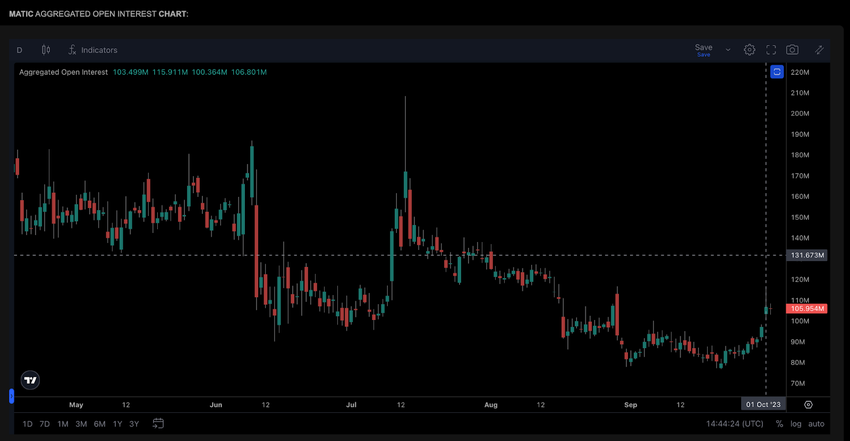 L’Open Interest aggregato del MATIC era di 86 miliardi di dollari al suo minimo del 28 settembre, secondo il grafico Coinalyze qui sotto. Entro 24 ore dalla notizia, questa cifra ha iniziato a salire, raggiungendo una picca a 30 giorni di 116 milioni di dollari il 1° ottobre.