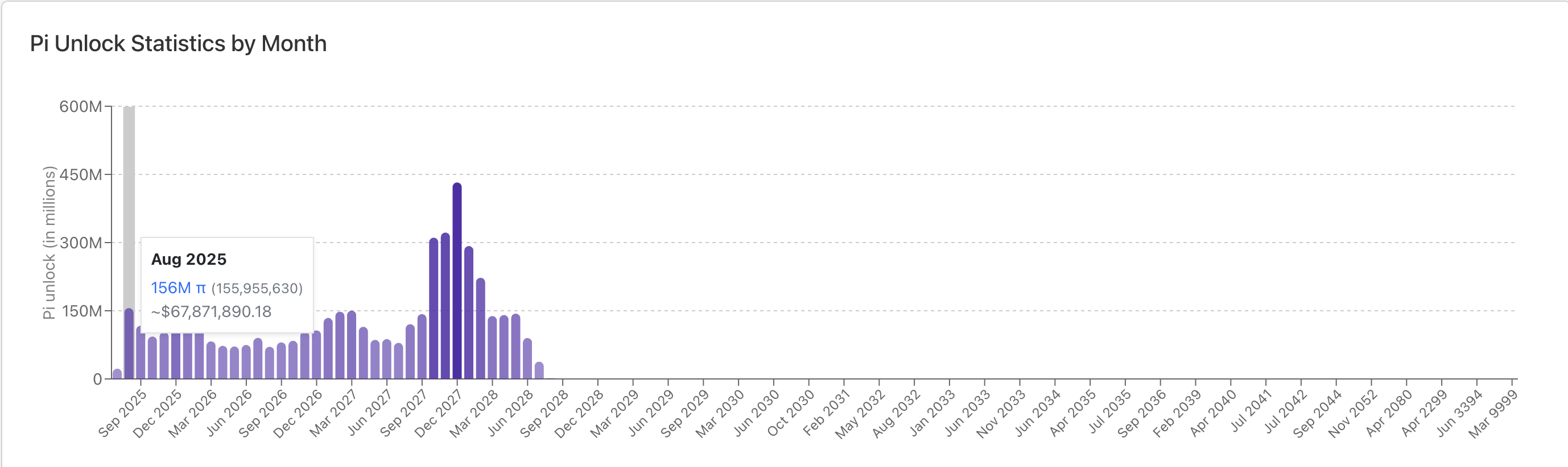 Pi affronta un significativo evento di sblocco di token ad agosto. Secondo i dati di PiScan, 156 milioni di token (per un valore di circa $68 milioni ai prezzi attuali) sono programmati per essere sbloccati nel corso del periodo di 31 giorni.