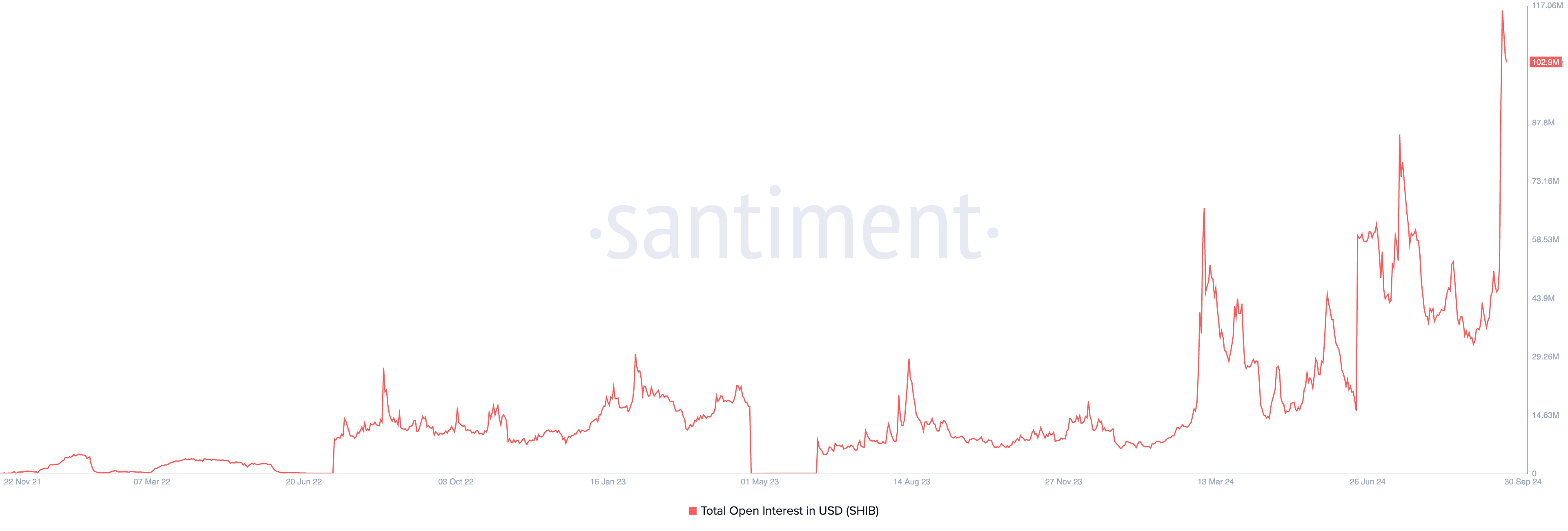 SponsoredInoltre, il calo dell’interesse aperto (OI) di SHIB riflette una diminuzione dell’attività di mercato. Dopo aver raggiunto un massimo storico di 116 milioni USD il 27 settembre, il suo OI è sceso dell’11%, attestandosi a 103 milioni USD al momento della pubblicazione.
