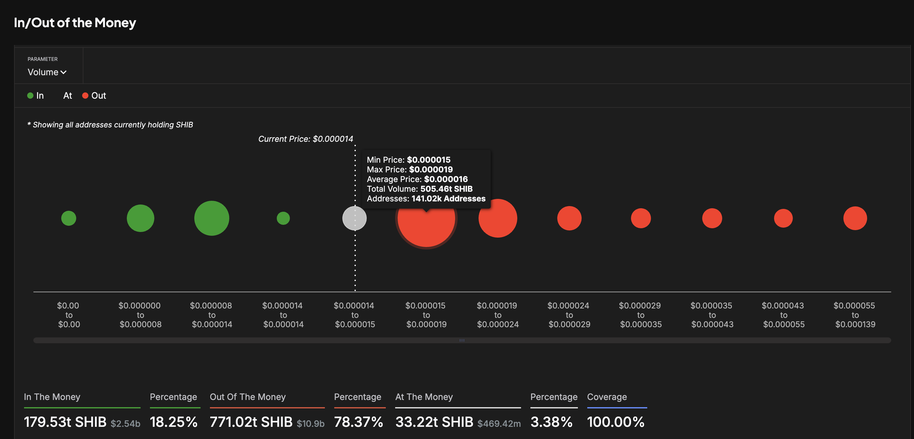 Il più grande gruppo di indirizzi, che rappresenta coloro che detengono SHIB tra $0,000015 e $0,000019, forma una densa zona “out of the money”.