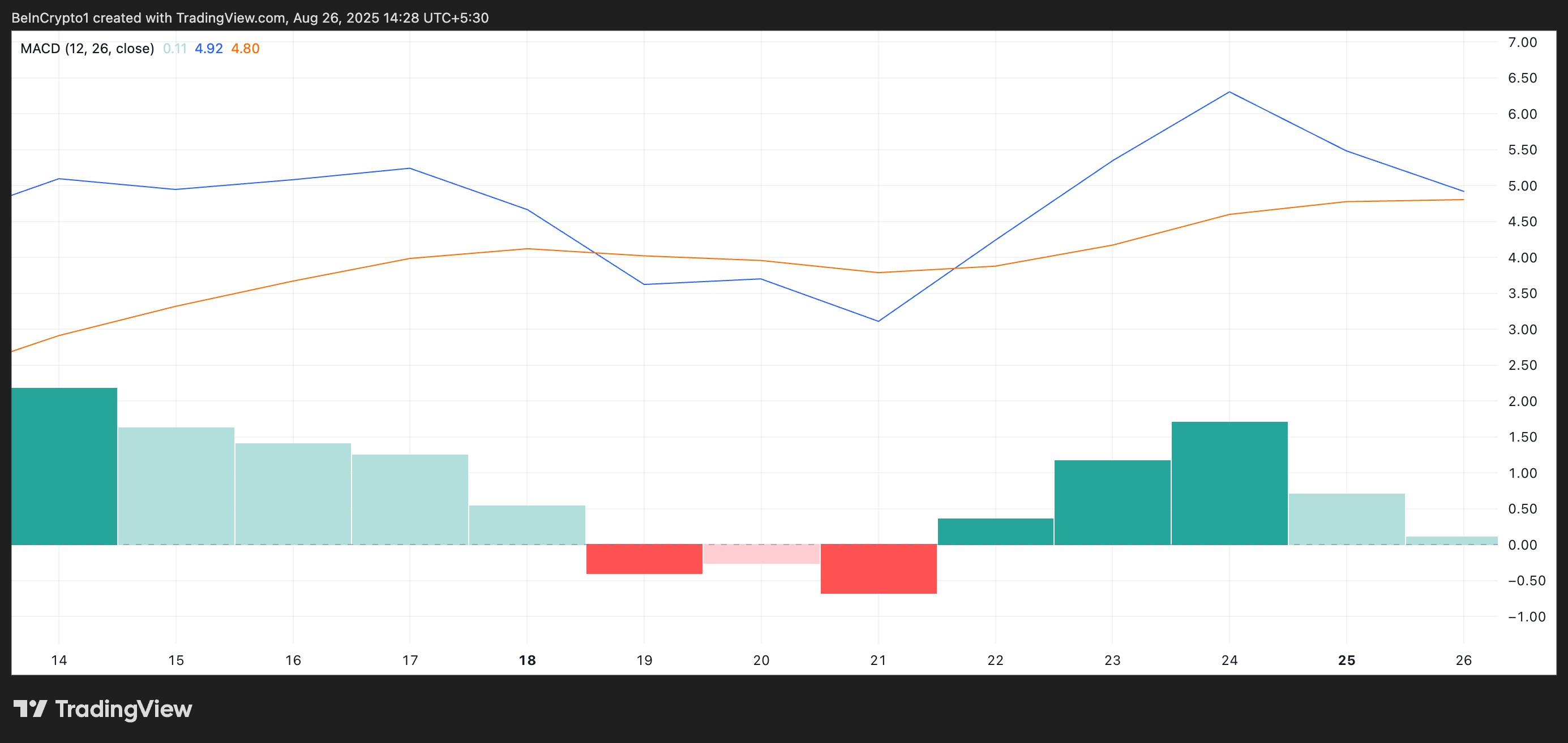 Come con SOL, quando la linea MACD incrocia al di sotto della linea di segnale, segnala un crescente momentum ribassista e una forza d’acquisto in diminuzione.