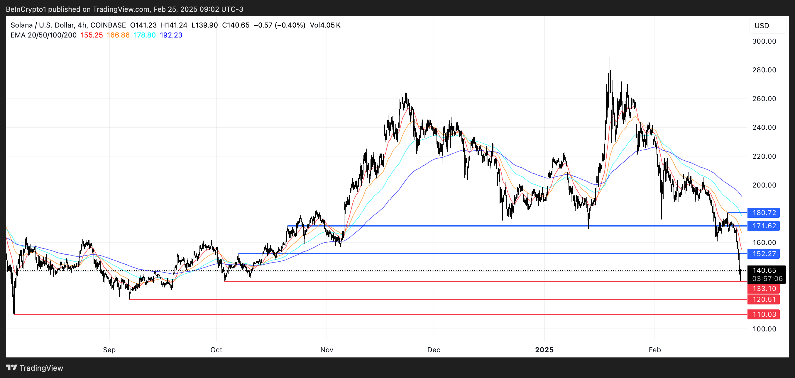 SponsoredQuesto indica un forte momentum al ribasso e suggerisce che la pressione di vendita è dominante. Se questo trend al ribasso continuasse, SOL potrebbe testare il supporto a $133, e se quel livello venisse perso, potrebbe scendere ulteriormente a $120 o addirittura $110, che sarebbe il suo punto più basso da agosto 2024.