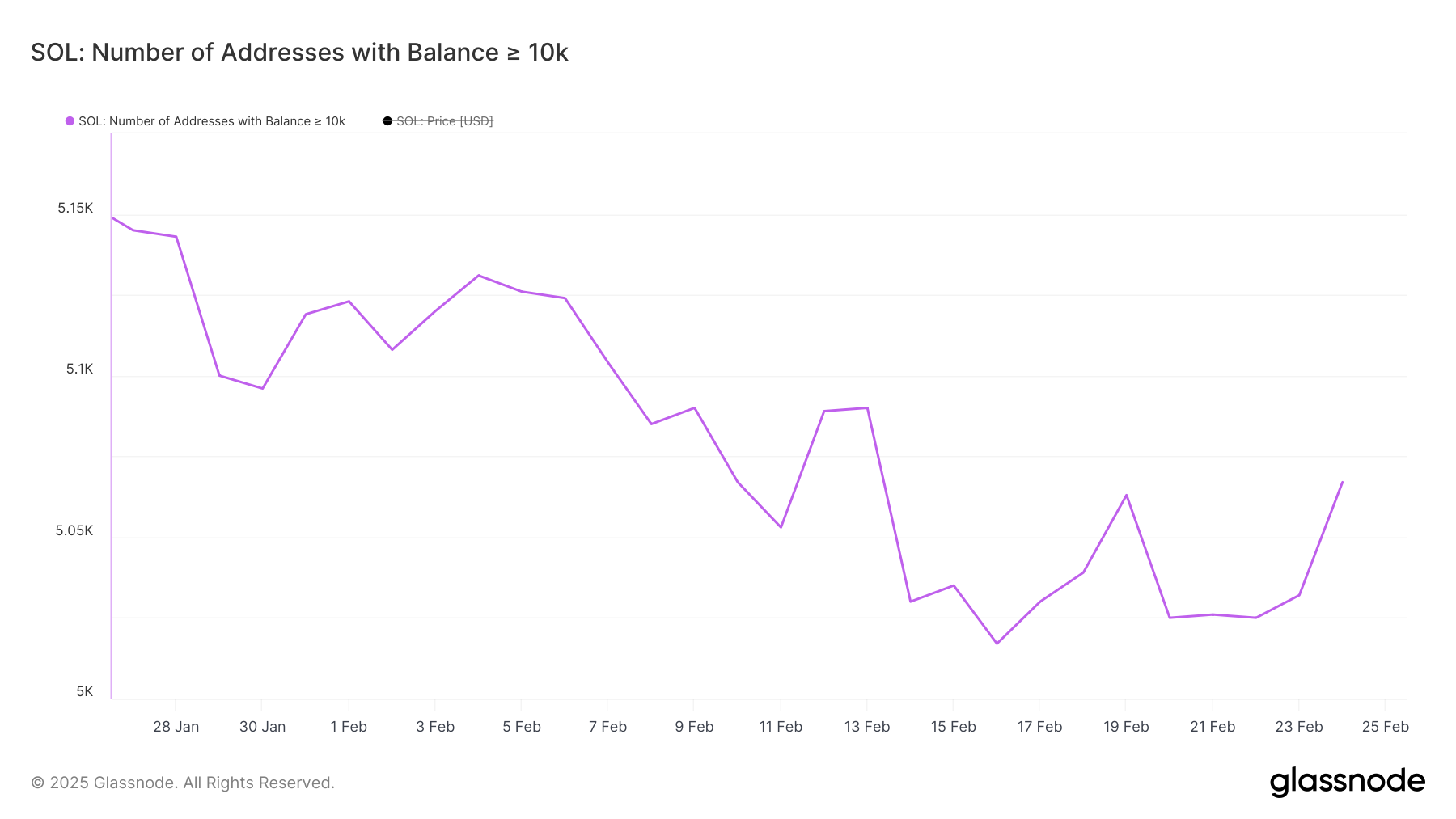 Il numero di balene di Solana – indirizzi che detengono almeno 10.000 SOL – è diminuito costantemente negli ultimi 30 giorni, raggiungendo 5.017 il 16 febbraio, il livello più basso da dicembre 2024.