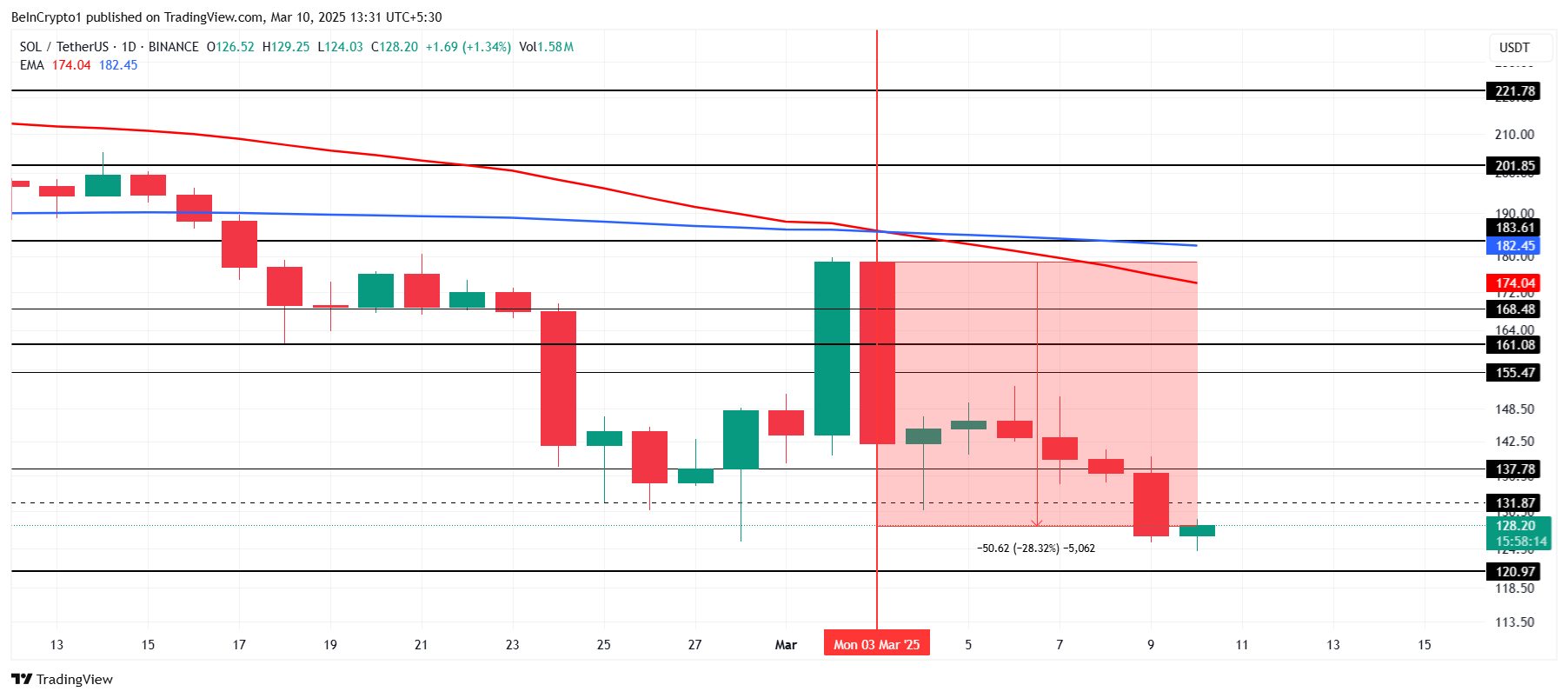 Il prezzo di Solana è sceso del 28% nelle ultime 24 ore, scambiando a $128. Il calo deriva dalla generale tendenza ribassista del mercato e dalla formazione della Death Cross sul grafico di SOL la scorsa settimana. Questo pattern tecnico suggerisce un ulteriore ribasso a meno che non emerga una forte pressione d’acquisto.