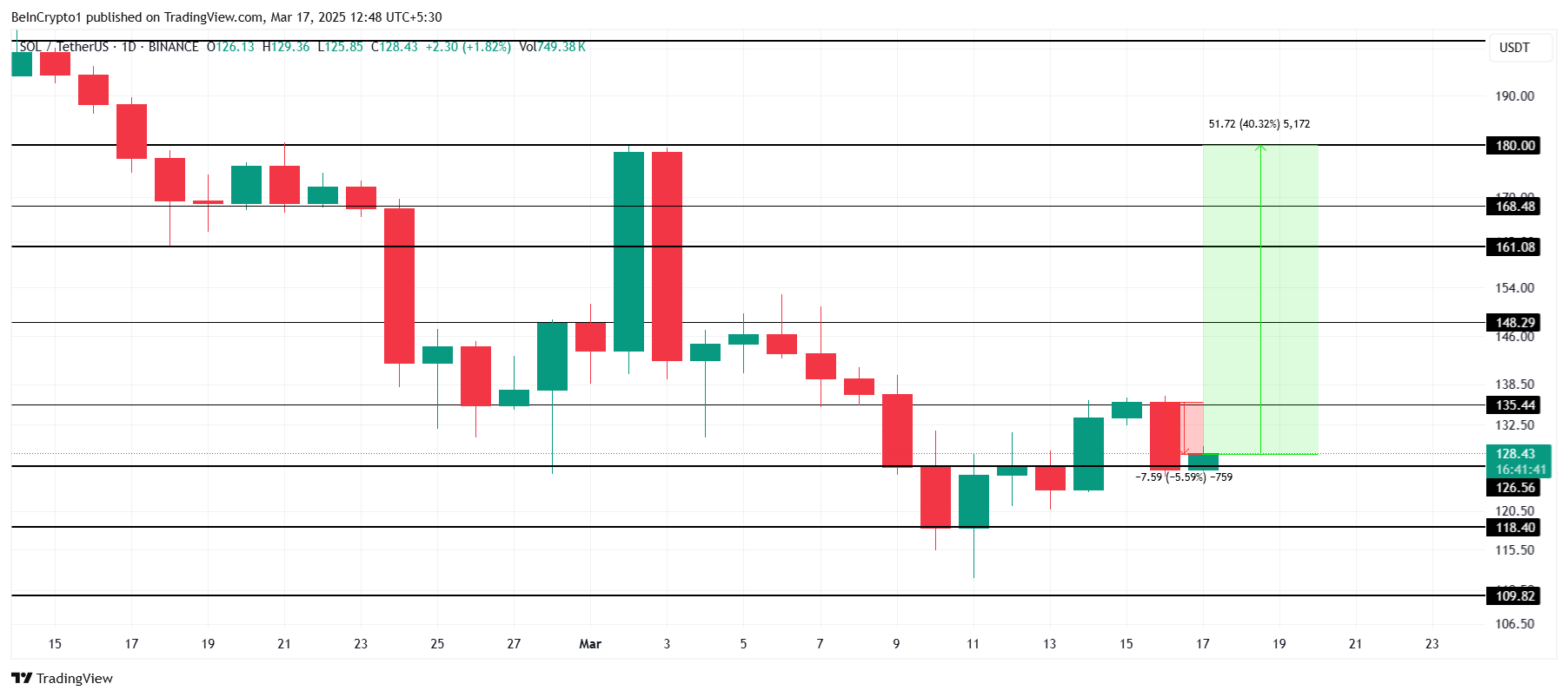 Solana è attualmente scambiata a $128, e il prezzo del token crypto è in calo del 5,5% nelle ultime 24 ore. Nonostante il calo, SOL si mantiene sopra il livello di supporto di $126 mentre tenta di superare la resistenza di $135. L’obiettivo a lungo termine rimane a $180, un traguardo cruciale per la conferma rialzista.
