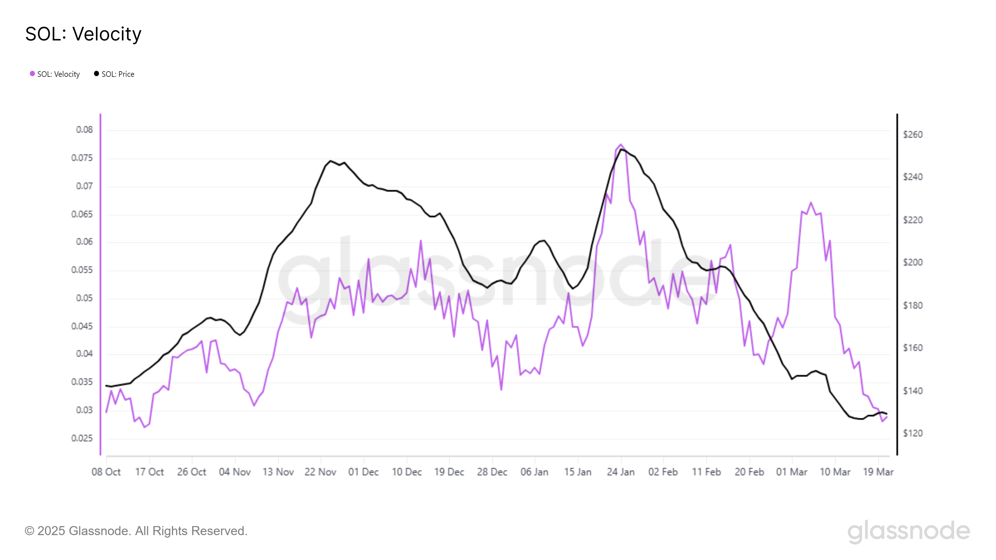 La velocità di Solana è scesa al minimo di 5 mesi, segnalando una domanda in calo. La velocità misura il tasso al quale un asset viene scambiato all’interno del mercato. I livelli di circolazione attuali di Solana sono paragonabili a quelli visti nell’ottobre 2024, un chiaro indicatore che la criptovaluta sta perdendo trazione.