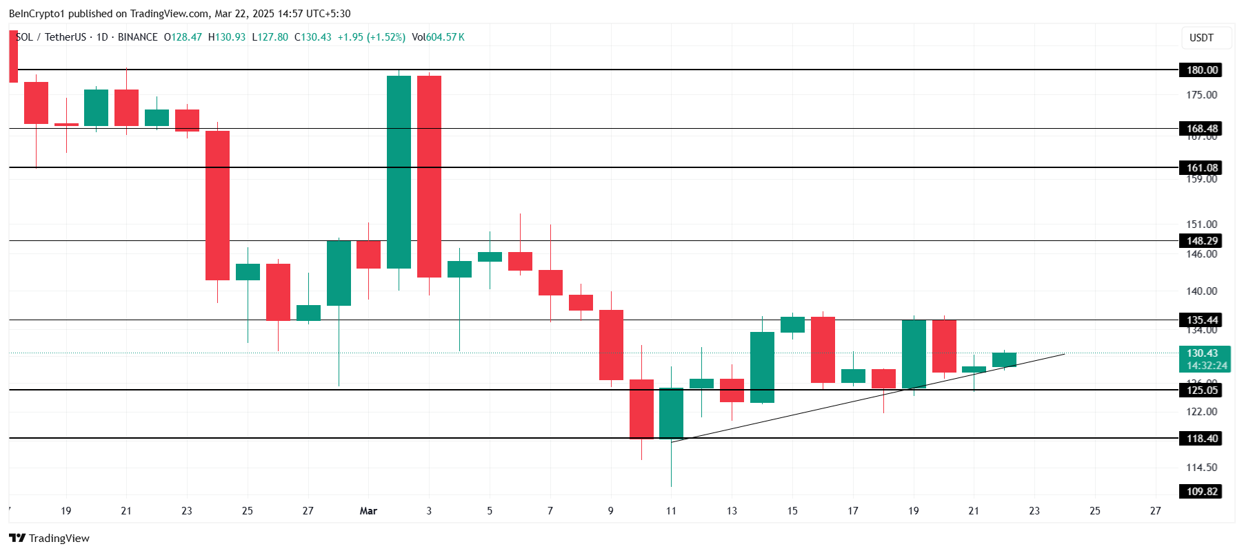 La combinazione di bassa domanda e debole sentimento di mercato indica un potenziale declino. Solana potrebbe cadere attraverso la sua linea di supporto del trend rialzista, con i prossimi livelli di supporto significativi situati a $125 e potenzialmente $118.