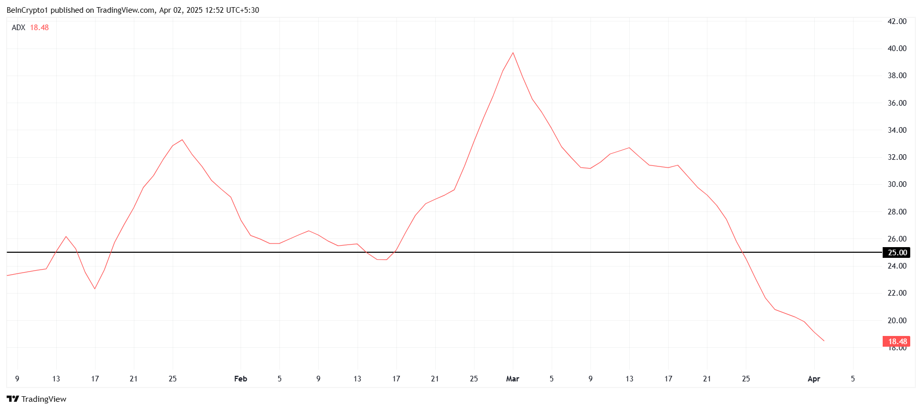 Il momentum macro complessivo di Solana mostra segni di ripresa. L’Average Directional Index (ADX) è sceso al di sotto della soglia di 25,0, segnalando che il precedente trend ribassista ha perso slancio. Questo suggerisce che Solana non è più in un forte trend ribassista, aprendo un’opportunità per un rally e un potenziale trend rialzista del prezzo.
