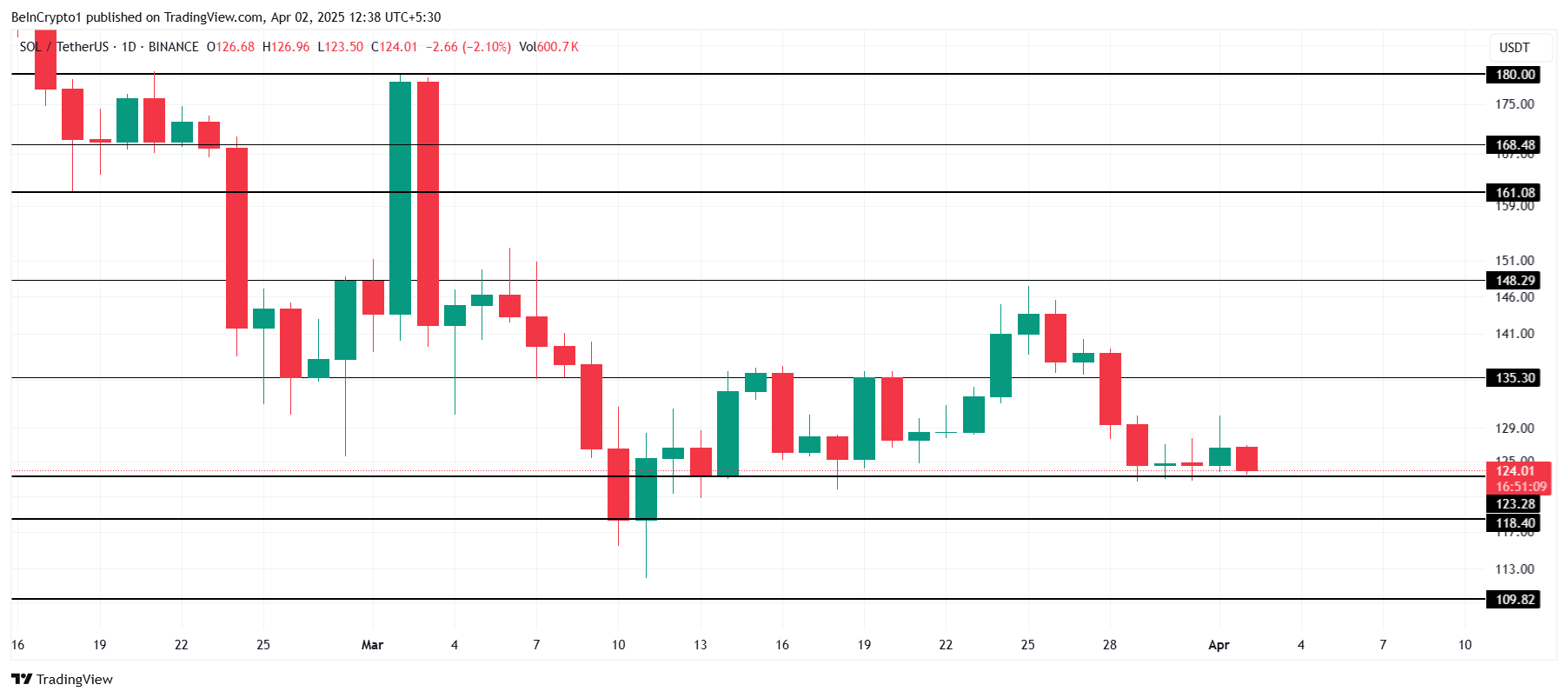 Tuttavia, se i segnali del mercato generale rimangono deboli e non supportano la crescita di Solana, l’altcoin potrebbe faticare a guadagnare slancio. In tale scenario, Solana potrebbe scendere sotto $123 e possibilmente raggiungere $118, con $109 che funge da prossimo supporto chiave.