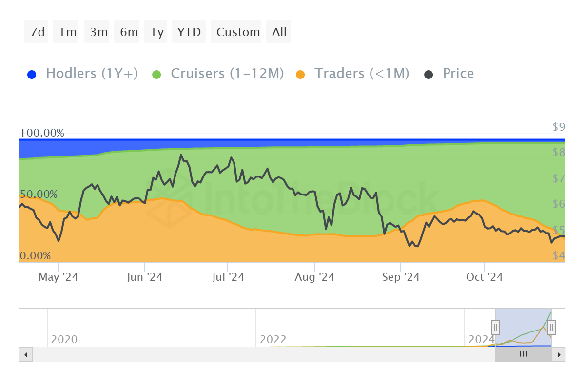 Il sentiment di mercato di Toncoin mostra segni promettenti di stabilità poiché i detentori a breve termine (STH) diventano detentori a medio termine (MTH). Negli ultimi due mesi, la dominanza dei MTH è cresciuta del 32%, con il 77% di tutti gli indirizzi TON che ora detengono i loro asset per più di un mese. Questo passaggio da una detenzione a breve a medio termine suggerisce un aumento della fiducia e dell’impegno degli investitori, un indicatore positivo per la stabilità dei prezzi.