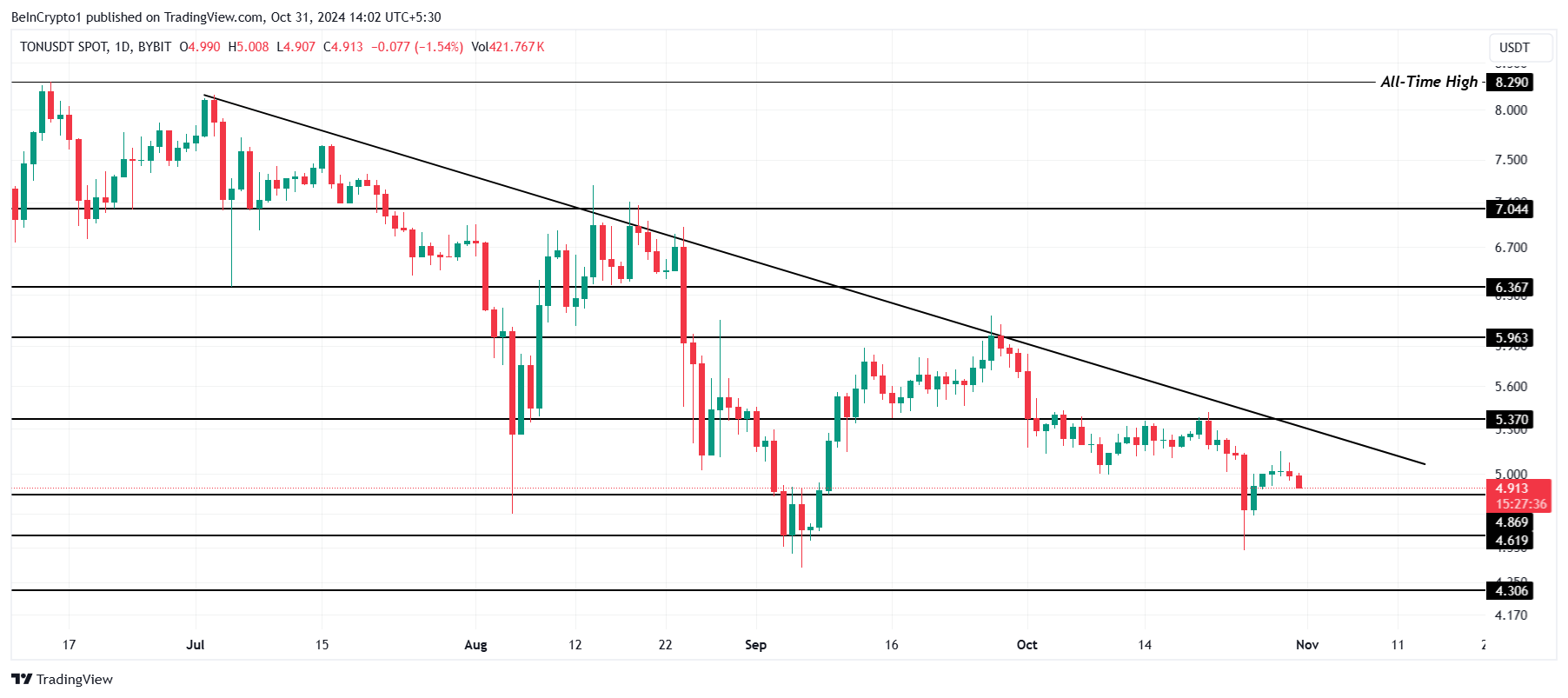 Attualmente, il prezzo di Toncoin è a 4,91 USD, con l’obiettivo di stabilire 4,86 USD come un solido livello di supporto. Assicurare questo livello è cruciale per TON, poiché fornisce una base da cui l’asset potrebbe mirare a recuperare. Mantenere sopra i 4,86 USD segnalerebbe la forza necessaria per ulteriori azioni rialziste.