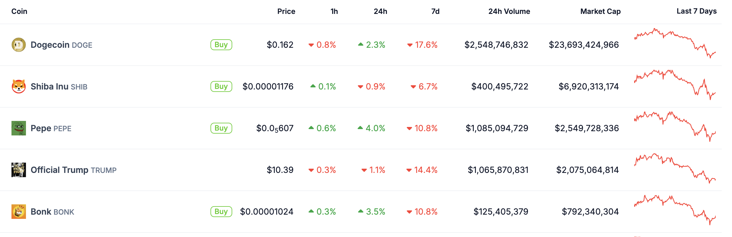 TRUMP è in calo di oltre il 14%, e PEPE e BONK hanno entrambe perso più del 10% nello stesso periodo.