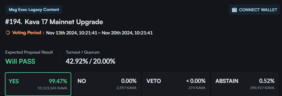 Un’altra notizia importante di crypto questa settimana è il periodo di votazione per l’aggiornamento della mainnet Kava 17 che termina il 20 novembre, attualmente approvato con il 99,47% dei voti.