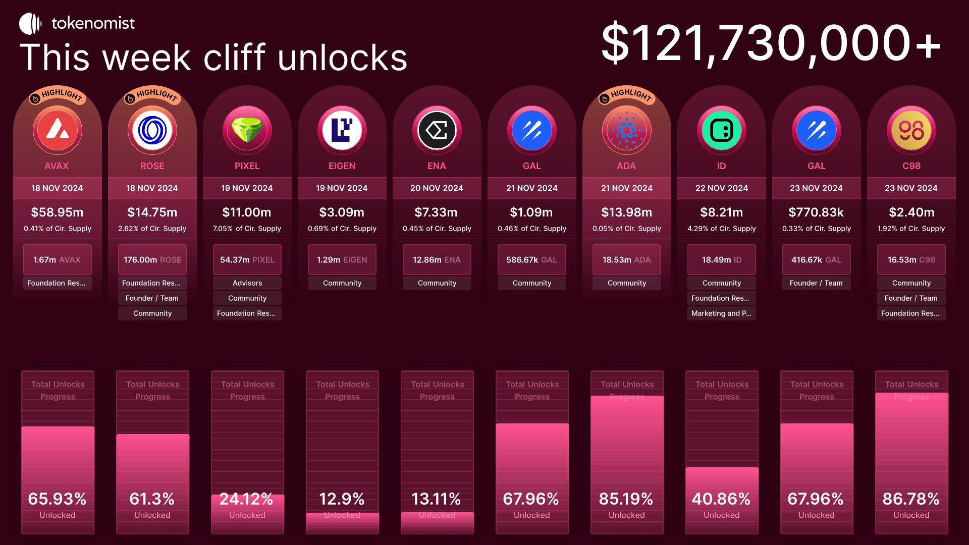 Presi insieme, questi tre eventi rappresentano sblocchi del valore di circa 90 milioni di USD da lunedì a giovedì. È importante notare che tutti questi eventi saranno sblocchi a scogliera, che aumentano le possibilità di impatti significativi sui prezzi. Gli investitori generalmente vedono gli sblocchi di token come catalizzatori ribassisti poiché aumentano l’offerta di token, potenzialmente superando la domanda.