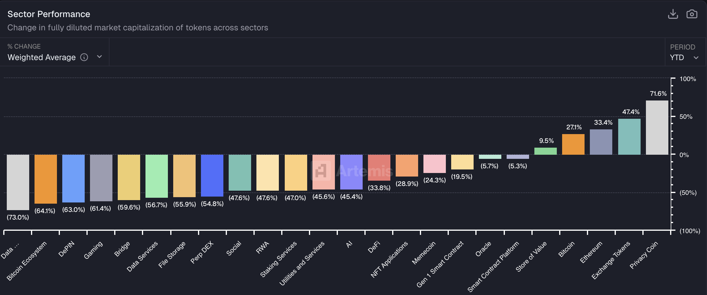 Nonostante ciò, le criptovalute incentrate sulla privacy hanno continuato a crescere. Secondo gli ultimi dati di Artemis, il settore è aumentato del 71,6% nel 2025, il più alto incremento tra tutti i settori crypto.