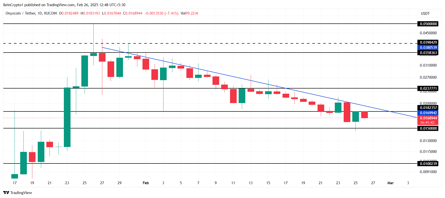 Il prezzo di Onyxcoin è attualmente a $0,0168 e sta cercando di uscire da un trend ribassista che dura da un mese. L’altcoin sta affrontando resistenza a $0,0182 e dovrà superare questo livello per confermare la sua ripresa. Mantenere sopra il livello di supporto cruciale di $0,0150 è fondamentale per qualsiasi potenziale breakout.