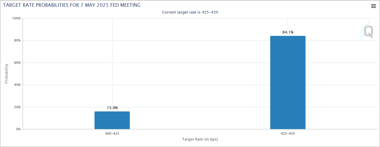 Secondo i dati di CME FedWatch, la probabilità di un taglio dei tassi di interesse da parte della Federal Reserve a maggio è crollata dal 57% a solo il 15%. Questo è dovuto alla pausa dei dazi di 90 giorni del Presidente Trump e ai verbali del FOMC di marzo appena rilasciati.