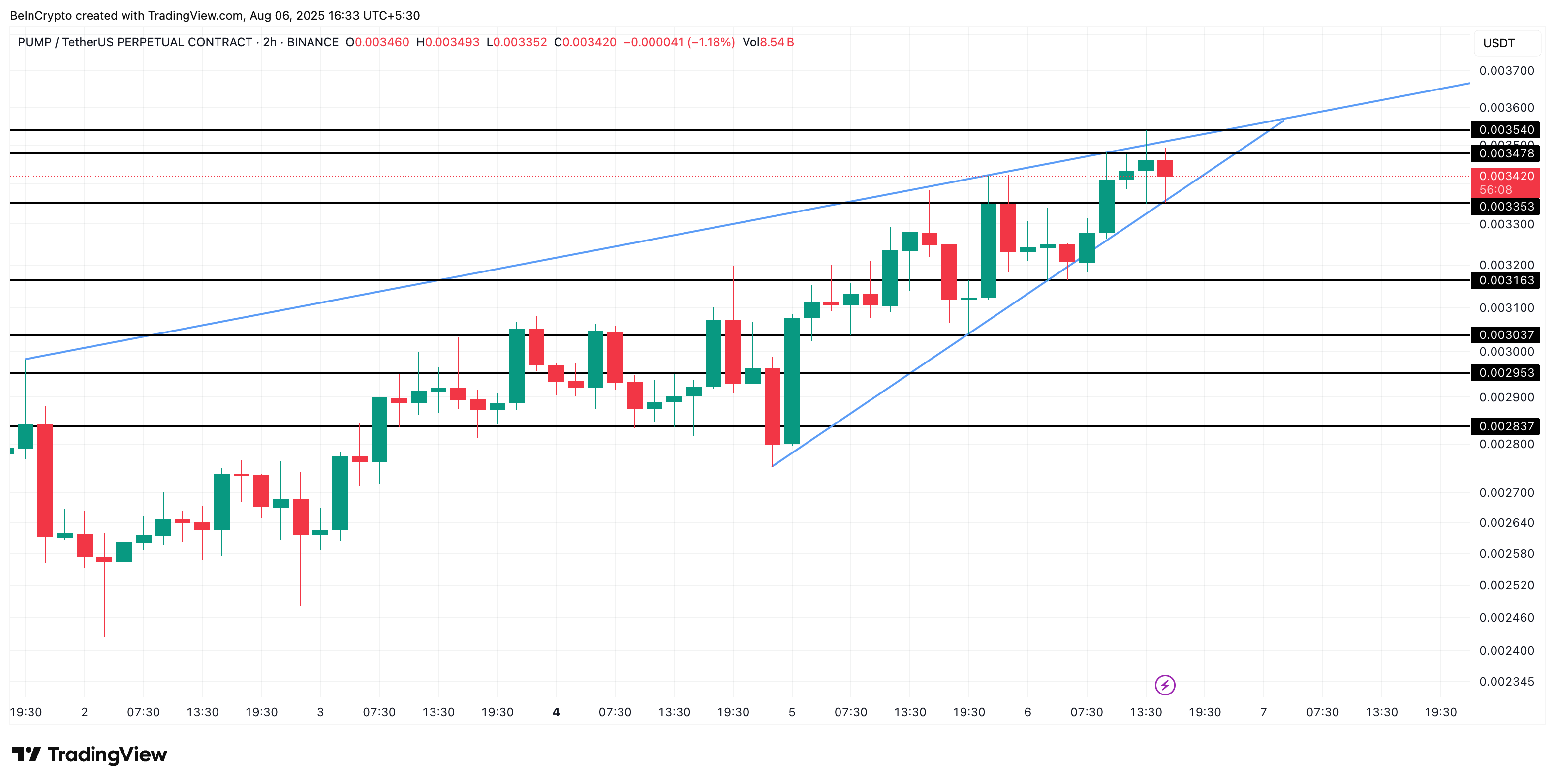 Il prezzo di PUMP è scambiato all’interno di un pattern a triangolo ascendente sul grafico a 2 ore. Questa configurazione di solito si risolve con un breakout al rialzo, specialmente quando supportata da minimi crescenti e accumulo, che è ciò che stiamo vedendo ora.