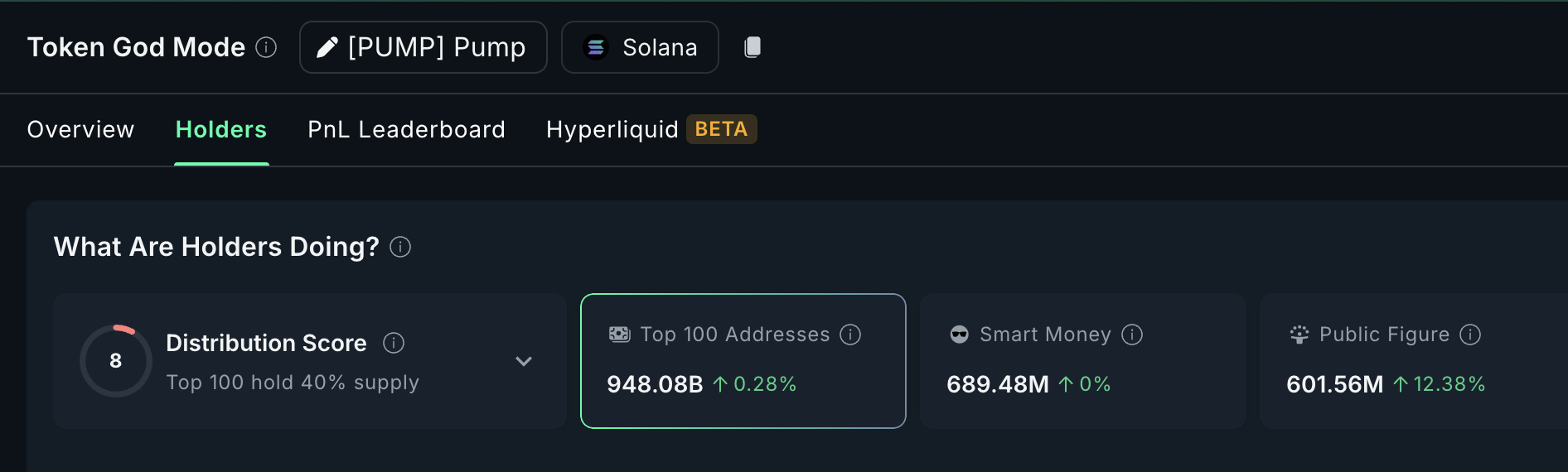 Mentre il prezzo si sta consolidando appena sotto il livello di $0,0035, i principali indirizzi e le figure pubbliche non mollano. Secondo i dati di Nansen, i primi 100 indirizzi ora detengono 948,08 miliardi di token, riflettendo un aumento dello 0,28% nelle ultime 24 ore. I wallet delle figure pubbliche, spesso collegati a influencer e noti trader crypto, sono aumentati del 12,38%, detenendo 601,56 milioni di PUMP.
