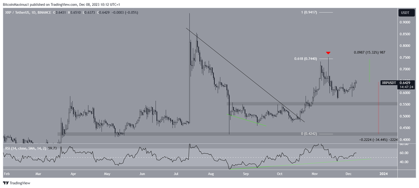 L’analisi tecnica dell’XRP su base all’arco temporale settimanale mostra che il prezzo scambia in un range orizzontale da quando ha raggiunto il massimo annuale di 0,95 dollari a luglio. Più recentemente, è stato respinto dal massimo del range di novembre (icona rossa), creando un lungo stoppino superiore e una candela ribassista.