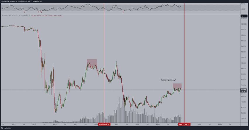 Allo stesso modo, Olszewicz ha sottolineato lo schema osservato nei cicli passati. La capitalizzazione di mercato totale delle altcoin, escluso il Bitcoin, tende a raggiungere e a superare la capitalizzazione di mercato del Bitcoin dopo l’halving. Questo fenomeno è significativo perché illustra un cambiamento nel sentimento degli investitori e nell’allocazione del capitale all’interno del mercato delle criptovalute.