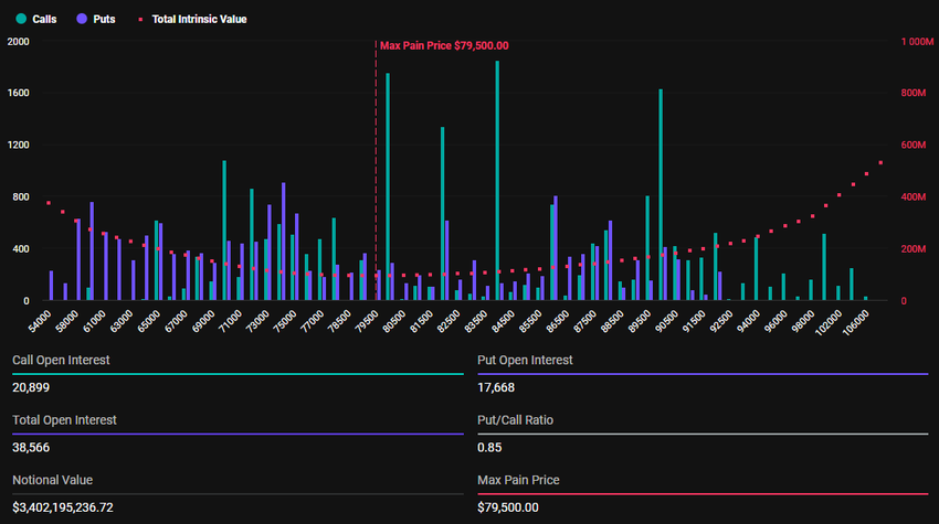 Per Bitcoin, le opzioni in scadenza hanno un prezzo di massimo dolore di 79 500 USD e un rapporto put-to-call di 0,85. Questo indica un sentimento generalmente rialzista nonostante il recente calo dell’asset. In confronto, le controparti di Ethereum hanno un prezzo di massimo dolore di 3 000 USD e un rapporto put-to-call di 0,92, riflettendo una prospettiva di mercato simile.
