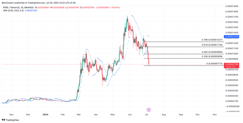 Il significativo orientamento ribassista che continua a seguire l’altcoin indica la possibilità di ulteriori liquidazioni lunghe. Secondo le letture dell’indicatore Parabolic Stop and Reverse (SAR) di PEPE, i suoi punti si trovano sopra il prezzo della memecoin al momento della stampa.