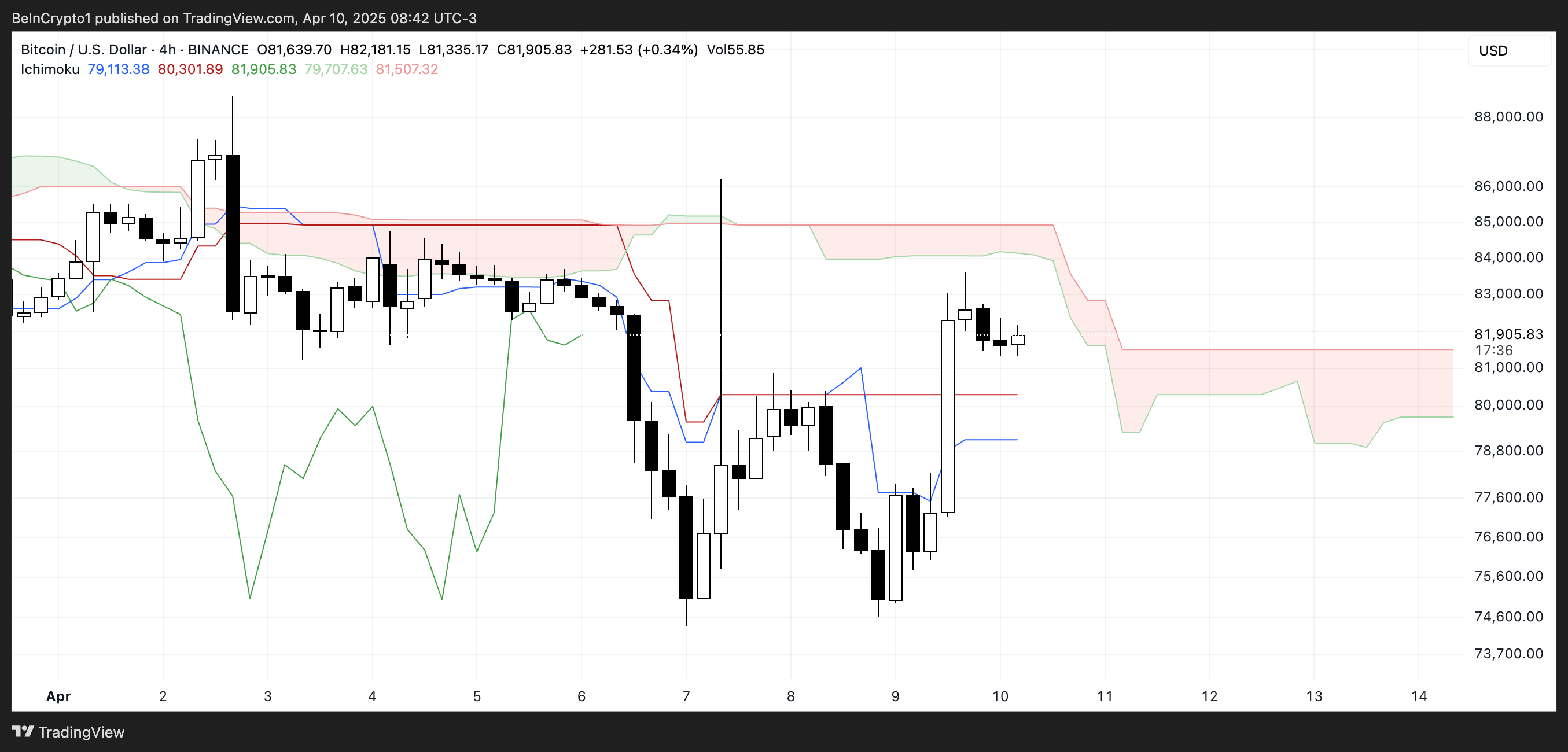 L’attuale configurazione della Ichimoku Cloud di Bitcoin mostra una struttura mista ma cautamente ottimista. Il movimento del prezzo si trova appena sopra la nuvola rossa (Kumo), suggerendo un recente breakout rialzista.
