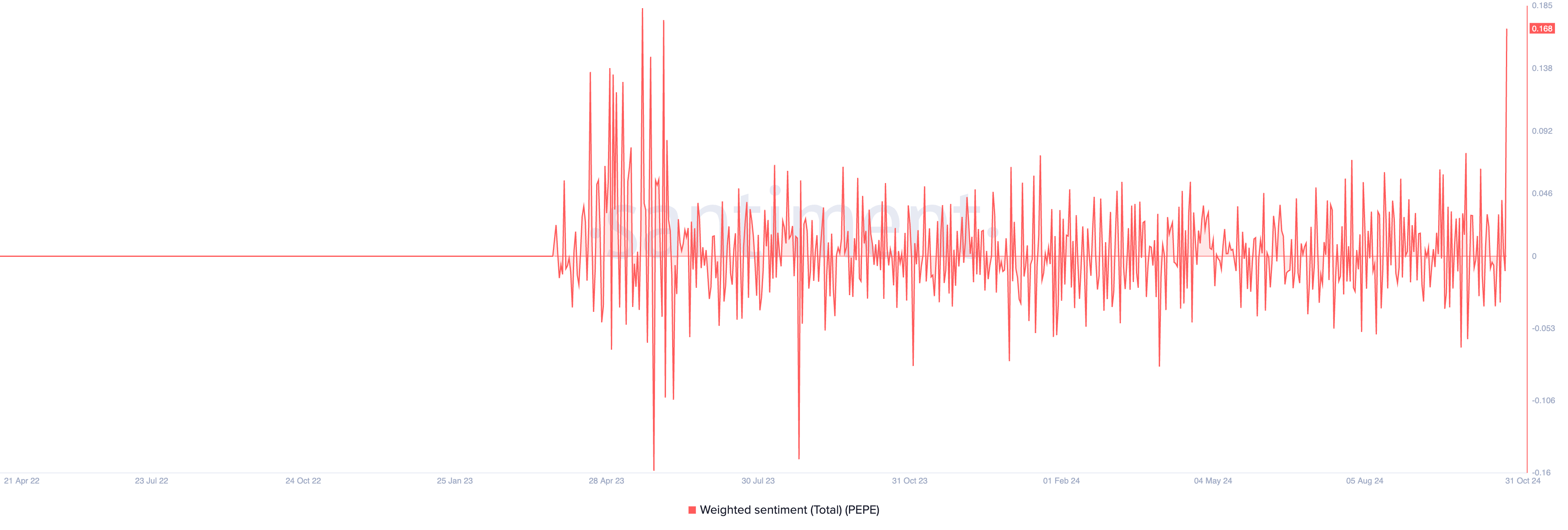 L’outlook rialzista di PEPE è ulteriormente rafforzato dal suo sentiment ponderato positivo, attualmente a 0,168, il più alto da maggio. Il sentiment ponderato misura l’umore generale del mercato, con valori sopra zero che indicano discussioni sui social media prevalentemente positive. Questo sentiment positivo suggerisce che i partecipanti al mercato prevedono una continua crescita del prezzo.