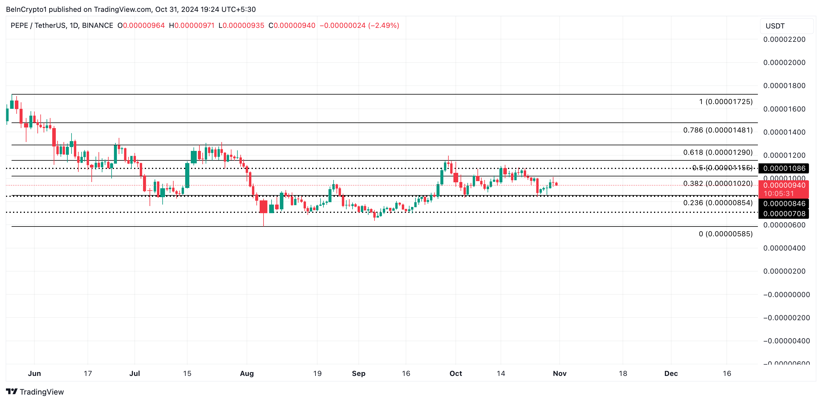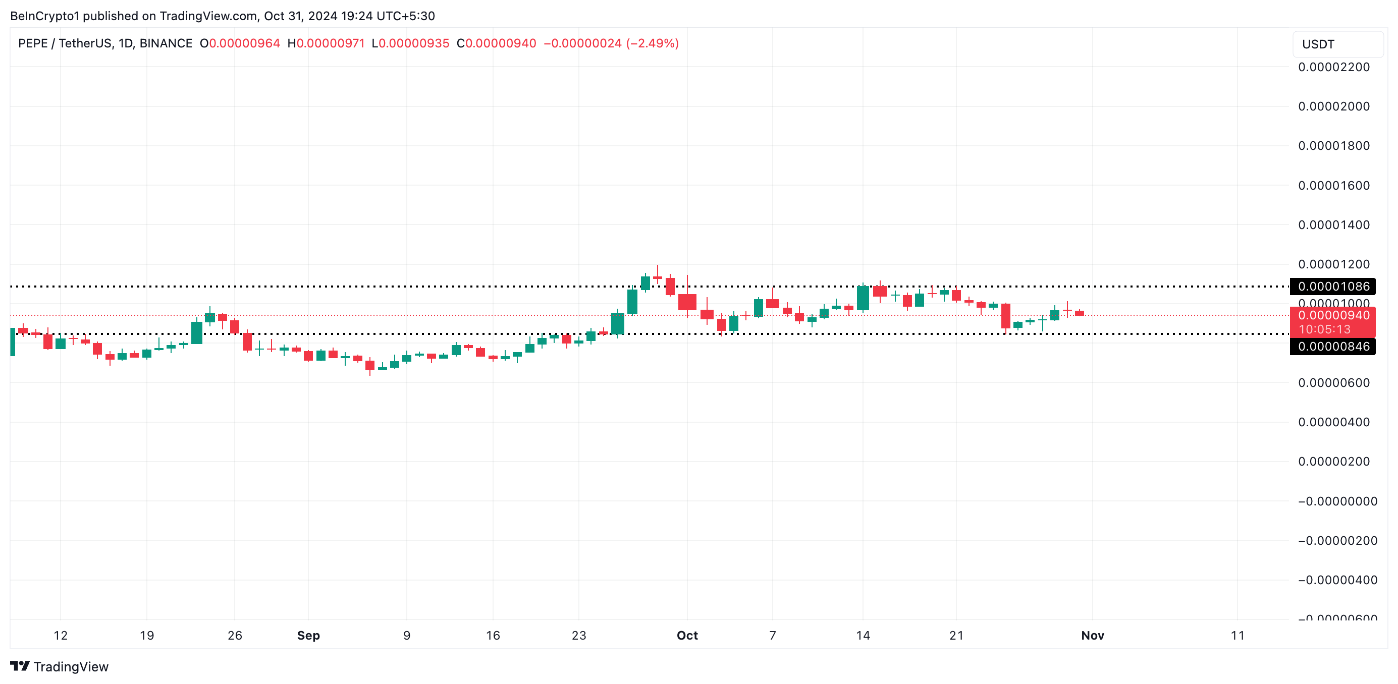 Pepe (PEPE), un popolare memecoin, ha scambiato entro un intervallo definito per tutto ottobre, incontrando resistenza a 0,000010 USD e trovando supporto a 0,00000084 USD.