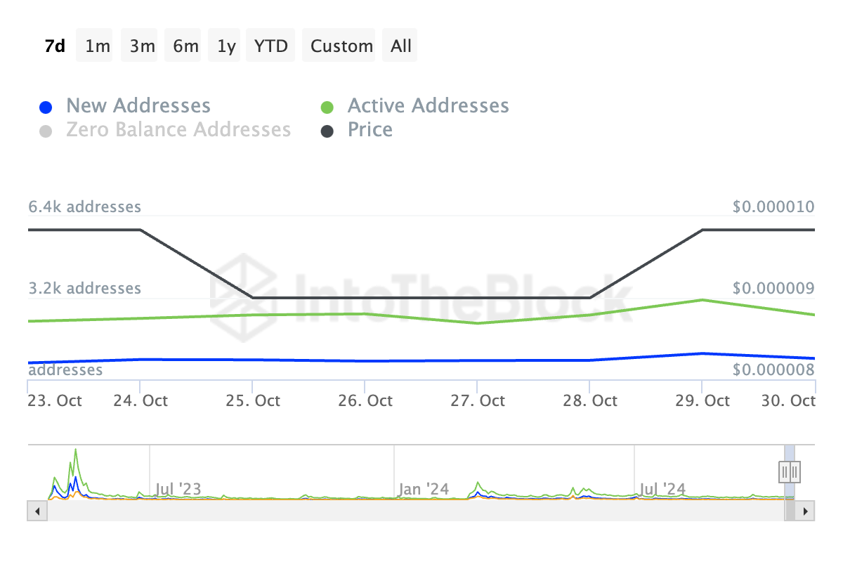 Quando il prezzo di un asset sale insieme a un aumento degli indirizzi attivi giornalieri (DAA) e nuovi indirizzi, spesso indica una crescente attività della rete e interesse degli utenti. Una lettura combinata del prezzo in aumento di PEPE e del conteggio degli indirizzi attivi è un segnale rialzista che suggerisce un aumento dell’interesse per il memecoin.