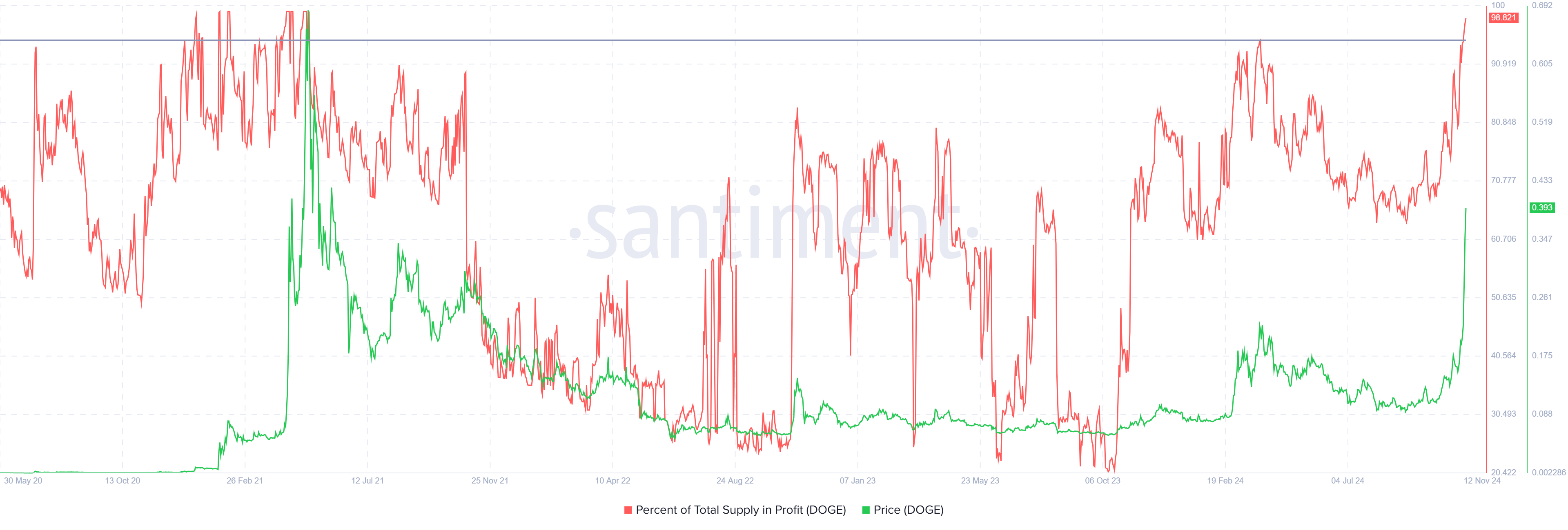 Attualmente, circa il 98% dell’offerta totale di Dogecoin è in profitto, indicando guadagni significativi per la maggior parte degli investitori. Storicamente, quando oltre il 95% dell’offerta di una moneta è in profitto, segnala un possibile picco di mercato.